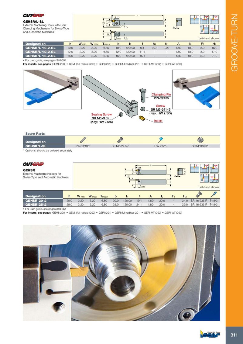 l1 l2 GEHSR/L-SL H2 h F1 h External Machining Tools with Side h4 A Clamping Mechanism for Swiss-Type and Automatic Machines f W b Tmax-r f2 Left-hand shown Designation h W min W max T max-r b l 1 f h 4 f 2 A l 2 F 1 H 2 GEHSR/L 10-2-SL 10.0 2.20 3.20 6.80 10.0 120.00 9.1 2.0 2.00 1.80 18.0 8.0 15.0 GEHSR/L 12-2-SL 12.0 2.20 3.20 6.80 12.0 120.00 11.1 - - 1.80 18.0 8.0 17.0 GEHSR/L 16-2-SL 16.0 2.20 3.20 6.80 16.0 120.00 15.1 - - 1.80 18.0 8.0 21.0 • For user guide, see pages 340-351 For inserts, see pages: GEMI (290) • GEMI (full radius) (290) • GEPI (291) • GEPI (full radius) (291) • GEPI-MT (292) • GEPI-WT (293) GROOVE-TURN Clamping Pin PIN-22435 Screw SR M5-24145 Sealing Screw (Key: HW 2.5/5) SR M5x3.5PL (Key: HW 2.5/5) Insert Spare Parts Designation GEHSR/L-SL PIN-22435* SR M5-24145 HW 2.5/5 SR M5X3.5PL * Optional, should be ordered separately l1 l2 GEHSR h F1 h H2 External Machining Holders for Swiss-Type and Automatic Machines W A f b Tmax-r Left-hand shown Designation h W min W max T max-r b l 1 f A l 2 F 1 H 2 GEHSR 20-2 20.0 2.20 3.20 6.80 20.0 120.00 19.1 1.80 20.0 - 24.0 SR 16-236 P T-15/3 GEHSR 25-2 25.0 2.20 3.20 6.80 25.0 120.00 24.1 1.80 20.0 - 29.0 SR 16-236 P T-15/3 • For user guide, see pages 340-351 For inserts, see pages: GEMI (290) • GEMI (full radius) (290) • GEPI (291) • GEPI (full radius) (291) • GEPI-MT (292) • GEPI-WT (293) 311