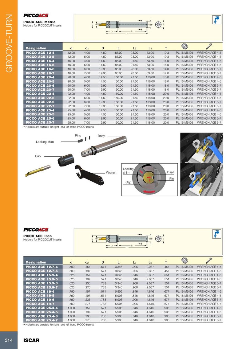 PICCO ACE Metric Holders for PICCOCUT Inserts D d2 dg6 T L5 L3 L Designation d d 2 D L L 5 L 3 T PICCO ACE 12-4 12.00 4.00 14.50 85.00 23.00 53.00 10.3 PL 16 M6-D5 WRENCH ACE 4-5 PICCO ACE 12-5 12.00 5.00 14.50 85.00 23.00 53.00 10.3 PL 16 M6-D5 WRENCH ACE 4-5 PICCO ACE 16-4 16.00 4.00 14.50 85.00 21.50 53.50 14.0 PL 16 M6-D5 WRENCH ACE 4-5 PICCO ACE 16-5 16.00 5.00 14.50 85.00 21.50 53.00 14.0 PL 16 M6-D5 WRENCH ACE 4-5 PICCO ACE 16-6 16.00 6.00 19.90 85.00 23.00 53.50 14.0 PL 16 M6-D5 WRENCH ACE 6-7 GROOVE-TURN PICCO ACE 16-7 16.00 7.00 19.90 85.00 23.00 53.50 14.0 PL 16 M6-D5 WRENCH ACE 6-7 PICCO ACE 20-4 20.00 4.00 14.50 150.00 21.50 118.00 18.0 PL 16 M6-D5 WRENCH ACE 4-5 PICCO ACE 20-5 20.00 5.00 14.50 150.00 21.50 118.00 18.0 PL 16 M6-D5 WRENCH ACE 4-5 PICCO ACE 20-6 20.00 6.00 19.90 150.00 21.50 118.00 18.0 PL 16 M6-D5 WRENCH ACE 6-7 PICCO ACE 20-7 20.00 7.00 19.90 150.00 21.50 118.00 18.0 PL 16 M6-D5 WRENCH ACE 6-7 PICCO ACE 22-4 22.00 4.00 14.50 150.00 21.50 118.00 20.0 PL 16 M6-D5 WRENCH ACE 4-5 PICCO ACE 22-5 22.00 5.00 14.50 150.00 21.50 118.00 20.0 PL 16 M6-D5 WRENCH ACE 4-5 PICCO ACE 22-6 22.00 6.00 19.90 150.00 21.50 118.00 20.0 PL 16 M6-D5 WRENCH ACE 6-7 PICCO ACE 22-7 22.00 7.00 19.90 150.00 21.50 118.00 20.0 PL 16 M6-D5 WRENCH ACE 6-7 PICCO ACE 25-4 25.00 4.00 14.50 150.00 21.50 118.00 20.0 PL 16 M6-D5 WRENCH ACE 4-5 PICCO ACE 25-5 25.00 5.00 14.50 150.00 21.50 118.00 20.0 PL 16 M6-D5 WRENCH ACE 4-5 PICCO ACE 25-6 25.00 6.00 19.90 150.00 21.50 118.00 20.0 PL 16 M6-D5 WRENCH ACE 6-7 PICCO ACE 25-7 25.00 7.00 19.90 150.00 21.50 118.00 20.0 PL 16 M6-D5 WRENCH ACE 6-7 • Holders are suitable for right- and left-hand PICCO inserts Pins Body Locking shim Cap Locking Wrench shim Insert Pin Cap PICCO ACE Inch Holders for PICCOCUT Inserts D d2 dg6 T L5 L3 L Designation d d 2 D L L 5 L 3 T PICCO ACE 12.7-4 .500 .157 .571 3.346 .906 2.087 .457 PL 16 M6-D5 WRENCH ACE 4-5 PICCO ACE 12.7-5 .500 .197 .571 3.346 .906 2.087 .457 PL 16 M6-D5 WRENCH ACE 4-5 PICCO ACE 15.9-4 .625 .157 .571 3.346 .846 2.087 .551 PL 16 M6-D5 WRENCH ACE 4-5 PICCO ACE 15.9-5 .625 .197 .571 3.346 .846 2.087 .551 PL 16 M6-D5 WRENCH ACE 4-5 PICCO ACE 15.9-6 .625 .236 .783 3.346 .906 2.087 .551 PL 16 M6-D5 WRENCH ACE 6-7 PICCO ACE 15.9-7 .625 .276 .783 3.346 .906 2.087 .551 PL 16 M6-D5 WRENCH ACE 6-7 PICCO ACE 19-4 .750 .157 .571 5.906 .846 4.646 .677 PL 16 M6-D5 WRENCH ACE 4-5 PICCO ACE 19-5 .750 .197 .571 5.906 .846 4.646 .677 PL 16 M6-D5 WRENCH ACE 4-5 PICCO ACE 19-6 .750 .236 .783 5.906 .906 4.646 .677 PL 16 M6-D5 WRENCH ACE 6-7 PICCO ACE 19-7 .750 .276 .783 5.906 .906 4.646 .677 PL 16 M6-D5 WRENCH ACE 6-7 PICCO ACE 25.4-4 1.000 .157 .571 5.906 .846 4.646 .905 PL 16 M6-D5 WRENCH ACE 4-5 PICCO ACE 25.4-5 1.000 .197 .571 5.906 .846 4.646 .905 PL 16 M6-D5 WRENCH ACE 4-5 PICCO ACE 25.4-6 1.000 .236 .783 5.906 .846 4.646 .905 PL 16 M6-D5 WRENCH ACE 6-7 PICCO ACE 25.4-7 1.000 .276 .783 5.906 .846 4.646 .905 PL 16 M6-D5 WRENCH ACE 6-7 • Holders are suitable for right- and left-hand PICCO inserts 314 ISCAR