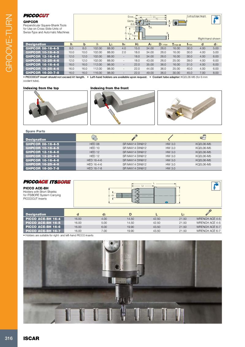 D1max l1 L5 Cutting Edge Height 70 Clamp H2 GHPCOR d-d1 h1 Perpendicular Square-Shank Tools h4 for Use on Cross Slide Units of Swiss-Type and Automatic Machines A1 fmax b Tmax-a Right-hand shown Designation h b l 1 L 5 h 4 H 2 A 1 D 1 max T max- a f max d d 1 GHPCOR 08-16-4-5 8.0 8.0 102.00 88.00 4.0 15.0 34.00 26.0 16.00 30.0 4.00 5.00 GHPCOR 10-16-4-5 10.0 10.0 102.00 88.00 2.0 18.0 34.00 26.0 16.00 30.0 4.00 5.00 GHPCOR 12-16-4-6 12.0 12.0 102.00 88.00 - 18.0 34.00 26.0 16.00 30.0 4.00 6.00 GHPCOR 12-25-4-6 12.0 12.0 102.00 88.00 - 18.0 43.00 26.0 25.00 39.0 4.00 6.00 GHPCOR 16-16-4-6 16.0 16.0 112.00 98.00 - 22.0 35.00 36.0 16.00 31.0 4.00 6.00 GHPCOR 16-25-4-6 16.0 16.0 112.00 98.00 - 22.0 44.00 36.0 25.00 40.0 4.00 6.00 GROOVE-TURN GHPCOR 16-30-7-8 16.0 16.0 116.00 98.00 - 22.0 49.00 36.0 30.00 45.0 7.00 8.00 • PICCOCUT insert should not exceed A1 length. • Left-hand holders are available upon request. • Coolant tube adapter: KQ2L06-M5 (for 6 mm coolant tube). Indexing from the top Indexing from the front Spare Parts Designation GHPCOR 08-16-4-5 HED 08 SR M4X14 DIN912 HW 3.0 KQ2L06-M5 GHPCOR 10-16-4-5 HED 10 SR M4X14 DIN912 HW 3.0 KQ2L06-M5 GHPCOR 12-16-4-6 HED 12 SR M4X14 DIN912 HW 3.0 KQ2L06-M5 GHPCOR 12-25-4-6 HED 12 SR M4X14 DIN912 HW 3.0 KQ2L06-M5 GHPCOR 16-16-4-6 HED 16-4-6 SR M4X14 DIN912 HW 3.0 KQ2L06-M5 GHPCOR 16-25-4-6 HED 16-4-6 SR M4X14 DIN912 HW 3.0 KQ2L06-M5 GHPCOR 16-30-7-8 HED 16-7-8 SR M4X14 DIN912 HW 3.0 L L5 PICCO ACE-BH Holders with Short Shanks for ITSBORE System Carrying D d2 d PICCOCUT Inserts Designation d d 2 D L L 5 PICCO ACE-BH 16-4 16.00 4.00 14.50 42.50 21.50 WRENCH ACE 4-5 PICCO ACE-BH 16-5 16.00 5.00 14.50 42.50 21.50 WRENCH ACE 4-5 PICCO ACE-BH 16-6 16.00 6.00 19.90 43.50 21.50 WRENCH ACE 6-7 PICCO ACE-BH 16-7 16.00 7.00 19.90 43.50 21.50 WRENCH ACE 6-7 • Holders are suitable for right- and left-hand PICCO inserts 316 ISCAR
