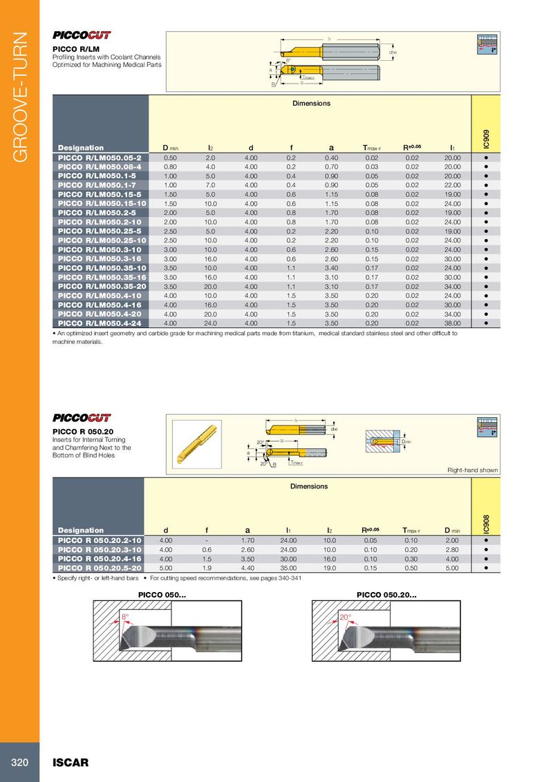 l1 PICCO R/LM dh6 Profiling Inserts with Coolant Channels 8° Optimized for Machining Medical Parts a f Tmax-r R l2 Dimensions Designation D min l 2 d f a T max-r R ±0.05 l 1 IC909 GROOVE-TURN PICCO R/LM050.05-2 0.50 2.0 4.00 0.2 0.40 0.02 0.02 20.00 • PICCO R/LM050.08-4 0.80 4.0 4.00 0.2 0.70 0.03 0.02 20.00 • PICCO R/LM050.1-5 1.00 5.0 4.00 0.4 0.90 0.05 0.02 20.00 • PICCO R/LM050.1-7 1.00 7.0 4.00 0.4 0.90 0.05 0.02 22.00 • PICCO R/LM050.15-5 1.50 5.0 4.00 0.6 1.15 0.08 0.02 19.00 • PICCO R/LM050.15-10 1.50 10.0 4.00 0.6 1.15 0.08 0.02 24.00 • PICCO R/LM050.2-5 2.00 5.0 4.00 0.8 1.70 0.08 0.02 19.00 • PICCO R/LM050.2-10 2.00 10.0 4.00 0.8 1.70 0.08 0.02 24.00 • PICCO R/LM050.25-5 2.50 5.0 4.00 0.2 2.20 0.10 0.02 19.00 • PICCO R/LM050.25-10 2.50 10.0 4.00 0.2 2.20 0.10 0.02 24.00 • PICCO R/LM050.3-10 3.00 10.0 4.00 0.6 2.60 0.15 0.02 24.00 • PICCO R/LM050.3-16 3.00 16.0 4.00 0.6 2.60 0.15 0.02 30.00 • PICCO R/LM050.35-10 3.50 10.0 4.00 1.1 3.40 0.17 0.02 24.00 • PICCO R/LM050.35-16 3.50 16.0 4.00 1.1 3.10 0.17 0.02 30.00 • PICCO R/LM050.35-20 3.50 20.0 4.00 1.1 3.10 0.17 0.02 34.00 • PICCO R/LM050.4-10 4.00 10.0 4.00 1.5 3.50 0.20 0.02 24.00 • PICCO R/LM050.4-16 4.00 16.0 4.00 1.5 3.50 0.20 0.02 30.00 • PICCO R/LM050.4-20 4.00 20.0 4.00 1.5 3.50 0.20 0.02 34.00 • PICCO R/LM050.4-24 4.00 24.0 4.00 1.5 3.50 0.20 0.02 38.00 • • An optimized insert geometry and carbide grade for machining medical parts made from titanium, medical standard stainless steel and other difficult to machine materials. l1 dh6 PICCO R 050.20 Inserts for Internal Turning 20° l2 Dmin and Chamfering Next to the a Bottom of Blind Holes f 20° R Tmax-r Right-hand shown Dimensions Designation d f a l 1 l 2 R ±0.05 T max-r D min IC908 PICCO R 050.20.2-10 4.00 - 1.70 24.00 10.0 0.05 0.10 2.00 • PICCO R 050.20.3-10 4.00 0.6 2.60 24.00 10.0 0.10 0.20 2.80 • PICCO R 050.20.4-16 4.00 1.5 3.50 30.00 16.0 0.10 0.30 4.00 • PICCO R 050.20.5-20 5.00 1.9 4.40 35.00 19.0 0.15 0.50 5.00 • • Specify right- or left-hand bars • For cutting speed recommendations, see pages 340-341 PICCO 050... PICCO 050.20... 8° 20° 320 ISCAR