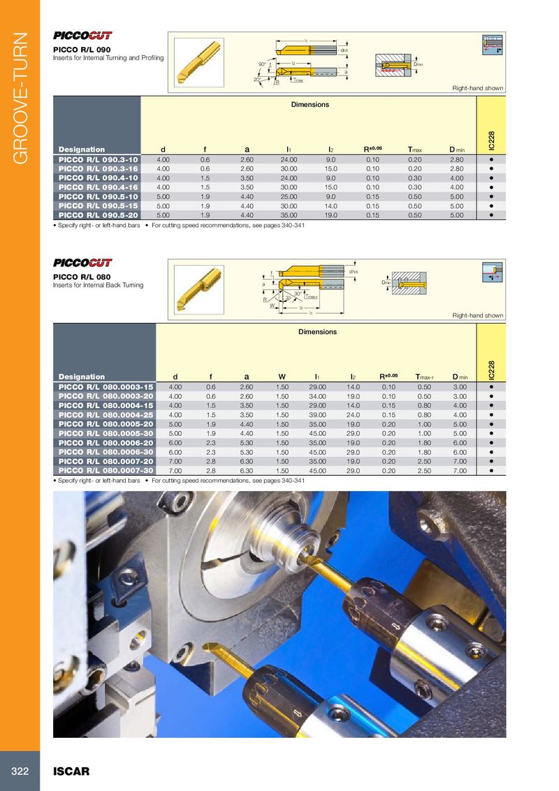 l1 PICCO R/L 090 dh6 Inserts for Internal Turning and Profiling 90° f l2 Dmin a 20° R Tmax Right-hand shown Dimensions Designation d f a l 1 l 2 R ±0.05 T max D min IC228 GROOVE-TURN PICCO R/L 090.3-10 4.00 0.6 2.60 24.00 9.0 0.10 0.20 2.80 • PICCO R/L 090.3-16 4.00 0.6 2.60 30.00 15.0 0.10 0.20 2.80 • PICCO R/L 090.4-10 4.00 1.5 3.50 24.00 9.0 0.10 0.30 4.00 • PICCO R/L 090.4-16 4.00 1.5 3.50 30.00 15.0 0.10 0.30 4.00 • PICCO R/L 090.5-10 5.00 1.9 4.40 25.00 9.0 0.15 0.50 5.00 • PICCO R/L 090.5-15 5.00 1.9 4.40 30.00 14.0 0.15 0.50 5.00 • PICCO R/L 090.5-20 5.00 1.9 4.40 35.00 19.0 0.15 0.50 5.00 • • Specify right- or left-hand bars • For cutting speed recommendations, see pages 340-341 f dh6 PICCO R/L 080 Inserts for Internal Back Turning a Dmin 30° Tmax-r R 3° W l2 l1 Right-hand shown Dimensions Designation d f a W l 1 l 2 R ±0.05 T max-r D min IC228 PICCO R/L 080.0003-15 4.00 0.6 2.60 1.50 29.00 14.0 0.10 0.50 3.00 • PICCO R/L 080.0003-20 4.00 0.6 2.60 1.50 34.00 19.0 0.10 0.50 3.00 • PICCO R/L 080.0004-15 4.00 1.5 3.50 1.50 29.00 14.0 0.15 0.80 4.00 • PICCO R/L 080.0004-25 4.00 1.5 3.50 1.50 39.00 24.0 0.15 0.80 4.00 • PICCO R/L 080.0005-20 5.00 1.9 4.40 1.50 35.00 19.0 0.20 1.00 5.00 • PICCO R/L 080.0005-30 5.00 1.9 4.40 1.50 45.00 29.0 0.20 1.00 5.00 • PICCO R/L 080.0006-20 6.00 2.3 5.30 1.50 35.00 19.0 0.20 1.80 6.00 • PICCO R/L 080.0006-30 6.00 2.3 5.30 1.50 45.00 29.0 0.20 1.80 6.00 • PICCO R/L 080.0007-20 7.00 2.8 6.30 1.50 35.00 19.0 0.20 2.50 7.00 • PICCO R/L 080.0007-30 7.00 2.8 6.30 1.50 45.00 29.0 0.20 2.50 7.00 • • Specify right- or left-hand bars • For cutting speed recommendations, see pages 340-341 322 ISCAR