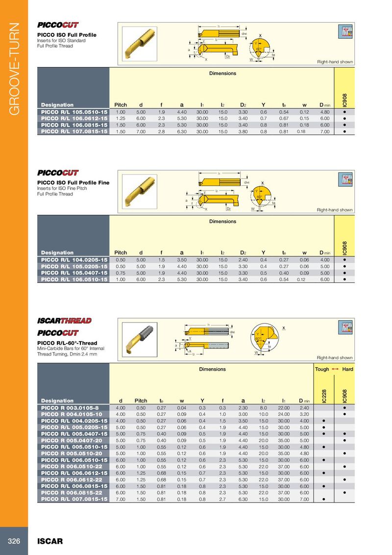 l1 PICCO ISO Full Profile dh6 X Inserts for ISO Standard y l2 Y Full Profile Thread a 60° f D2 te X W Right-hand shown Dimensions Designation Pitch d f a l 1 l 2 D 2 Y t e w D min IC908 GROOVE-TURN PICCO R/L 105.0510-15 1.00 5.00 1.9 4.40 30.00 15.0 3.30 0.6 0.54 0.12 4.80 • PICCO R/L 106.0612-15 1.25 6.00 2.3 5.30 30.00 15.0 3.40 0.7 0.67 0.15 6.00 • PICCO R/L 106.0815-15 1.50 6.00 2.3 5.30 30.00 15.0 3.40 0.8 0.81 0.18 6.00 • PICCO R/L 107.0815-15 1.50 7.00 2.8 6.30 30.00 15.0 3.80 0.8 0.81 0.18 7.00 • l1 PICCO ISO Full Profile Fine dh6 X Inserts for ISO Fine Pitch y l2 Y Full Profile Thread 60° a f te X D2 W Right-hand shown Dimensions Designation Pitch d f a l 1 l 2 D 2 Y t e w D min IC908 PICCO R/L 104.0205-15 0.50 5.00 1.5 3.50 30.00 15.0 2.40 0.4 0.27 0.06 4.00 • PICCO R/L 105.0205-15 0.50 5.00 1.9 4.40 30.00 15.0 3.30 0.4 0.27 0.06 5.00 • PICCO R/L 105.0407-15 0.75 5.00 1.9 4.40 30.00 15.0 3.30 0.5 0.40 0.09 5.00 • PICCO R/L 106.0510-15 1.00 6.00 2.3 5.30 30.00 15.0 3.40 0.6 0.54 0.12 6.00 • l1 X dh6 Y Y 60° PICCO R/L-60°-Thread a f te Mini-Carbide Bars for 60° Internal x Thread Turning, Dmin 2.4 mm l2 W Right-hand shown Dimensions Tough 1 Hard Designation d Pitch t e w Y f a l 2 l 1 D min IC228 IC908 PICCO R 003.0105-8 4.00 0.50 0.27 0.04 0.3 0.3 2.30 8.0 22.00 2.40 • PICCO R 004.0105-10 4.00 0.50 0.27 0.09 0.4 1.0 3.00 10.0 24.00 3.20 • PICCO R/L 004.0205-15 4.00 0.50 0.27 0.06 0.4 1.5 3.50 15.0 30.00 4.00 • PICCO R/L 005.0205-15 5.00 0.50 0.27 0.06 0.4 1.9 4.40 15.0 30.00 5.00 • PICCO R/L 005.0407-15 5.00 0.75 0.40 0.09 0.5 1.9 4.40 15.0 30.00 5.00 • • PICCO R 005.0407-20 5.00 0.75 0.40 0.09 0.5 1.9 4.40 20.0 35.00 5.00 • PICCO R/L 005.0510-15 5.00 1.00 0.55 0.12 0.6 1.9 4.40 15.0 30.00 4.80 • PICCO R 005.0510-20 5.00 1.00 0.55 0.12 0.6 1.9 4.40 20.0 35.00 4.80 • PICCO R/L 006.0510-15 6.00 1.00 0.55 0.12 0.6 2.3 5.30 15.0 30.00 6.00 • PICCO R 006.0510-22 6.00 1.00 0.55 0.12 0.6 2.3 5.30 22.0 37.00 6.00 • PICCO R/L 006.0612-15 6.00 1.25 0.68 0.15 0.7 2.3 5.30 15.0 30.00 6.00 • PICCO R 006.0612-22 6.00 1.25 0.68 0.15 0.7 2.3 5.30 22.0 37.00 6.00 • PICCO R/L 006.0815-15 6.00 1.50 0.81 0.18 0.8 2.3 5.30 15.0 30.00 6.00 • PICCO R 006.0815-22 6.00 1.50 0.81 0.18 0.8 2.3 5.30 22.0 37.00 6.00 • PICCO R/L 007.0815-15 7.00 1.50 0.81 0.18 0.8 2.7 6.30 15.0 30.00 7.00 • 326 ISCAR