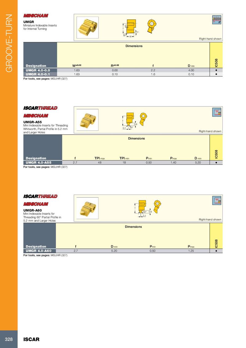 UMGR Miniature Indexable Inserts 3° for Internal Turning f 7° R W Right-hand shown Dimensions Designation W ±0.02 R ±0.02 f D min IC508 GROOVE-TURN UMGR 4.0-0.0 1.63 0.00 2.2 4.00 • UMGR 4.0-0.1 1.63 0.10 1.6 0.10 • For tools, see pages: MGUHR (327) f UMGR-A55 0.8 Mini Indexable Inserts for Threading Whitworth, Partial Profile in 5.2 mm 0.1 55 ° Right-hand shown and Larger Holes Dimensions Designation f TPI max TPI min P min P max D min IC508 UMGR 4.0-A55 2.7 48 18 0.50 1.40 5.20 • For tools, see pages: MGUHR (327) f UMGR-A60 60° 0.8 Mini Indexable Inserts for 0.1 Threading 60° Partial Profile in Right-hand shown 5.2 mm and Larger Holes Dimensions Designation f D min P min P max IC508 UMGR 4.0-A60 2.7 5.20 0.50 1.25 • For tools, see pages: MGUHR (327) 328 ISCAR