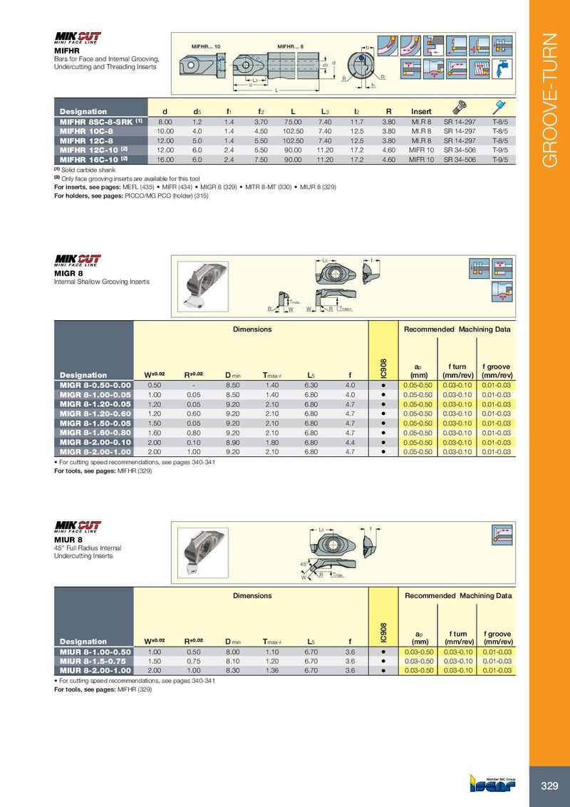 MIFHR... 10 MIFHR... 8 f2 MIFHR Bars for Face and Internal Grooving, Undercutting and Threading Inserts d5 d R R L3 l2 f1 L Designation d d 5 f 1 f 2 L L 3 l 2 R Insert MIFHR 8SC-8-SRK (1) 8.00 1.2 1.4 3.70 75.00 7.40 11.7 3.80 MI.R 8 SR 14-297 T-8/5 MIFHR 10C-8 10.00 4.0 1.4 4.50 102.50 7.40 12.5 3.80 MI.R 8 SR 14-297 T-8/5 MIFHR 12C-8 12.00 5.0 1.4 5.50 102.50 7.40 12.5 3.80 MI.R 8 SR 14-297 T-8/5 MIFHR 12C-10 (2) 12.00 6.0 2.4 5.50 90.00 11.20 17.2 4.60 MIFR 10 SR 34-506 T-9/5 MIFHR 16C-10 (2) 16.00 6.0 2.4 7.50 90.00 11.20 17.2 4.60 MIFR 10 SR 34-506 T-9/5 (1) GROOVE-TURN Solid carbide shank (2) Only face grooving inserts are available for this tool For inserts, see pages: MEFL (435) • MIFR (434) • MIGR 8 (329) • MITR 8-MT (330) • MIUR 8 (329) For holders, see pages: PICCO/MG PCO (holder) (315) L5 f MIGR 8 Internal Shallow Grooving Inserts Tmax. R W W R Tmax-r Dimensions Recommended Machining Data a p f turn f groove Designation W ±0.02 R ±0.02 D min T max-r L 5 f IC908 (mm) (mm/rev) (mm/rev) MIGR 8-0.50-0.00 0.50 - 8.50 1.40 6.30 4.0 • 0.05-0.50 0.03-0.10 0.01-0.03 MIGR 8-1.00-0.05 1.00 0.05 8.50 1.40 6.80 4.0 • 0.05-0.50 0.03-0.10 0.01-0.03 MIGR 8-1.20-0.05 1.20 0.05 9.20 2.10 6.80 4.7 • 0.05-0.50 0.03-0.10 0.01-0.03 MIGR 8-1.20-0.60 1.20 0.60 9.20 2.10 6.80 4.7 • 0.05-0.50 0.03-0.10 0.01-0.03 MIGR 8-1.50-0.05 1.50 0.05 9.20 2.10 6.80 4.7 • 0.05-0.50 0.03-0.10 0.01-0.03 MIGR 8-1.60-0.80 1.60 0.80 9.20 2.10 6.80 4.7 • 0.05-0.50 0.03-0.10 0.01-0.03 MIGR 8-2.00-0.10 2.00 0.10 8.90 1.80 6.80 4.4 • 0.05-0.50 0.03-0.10 0.01-0.03 MIGR 8-2.00-1.00 2.00 1.00 9.20 2.10 6.80 4.7 • 0.05-0.50 0.03-0.10 0.01-0.03 • For cutting speed recommendations, see pages 340-341 For tools, see pages: MIFHR (329) L5 f MIUR 8 45° Full Radius Internal Undercutting Inserts 45° W R Tmax Dimensions Recommended Machining Data a p f turn f groove Designation W ±0.02 R ±0.02 D min T max-r L 5 f IC908 (mm) (mm/rev) (mm/rev) MIUR 8-1.00-0.50 1.00 0.50 8.00 1.10 6.70 3.6 • 0.03-0.50 0.03-0.10 0.01-0.03 MIUR 8-1.5-0.75 1.50 0.75 8.10 1.20 6.70 3.6 • 0.03-0.50 0.03-0.10 0.01-0.03 MIUR 8-2.00-1.00 2.00 1.00 8.30 1.36 6.70 3.6 • 0.03-0.50 0.03-0.10 0.01-0.03 • For cutting speed recommendations, see pages 340-341 For tools, see pages: MIFHR (329) 329