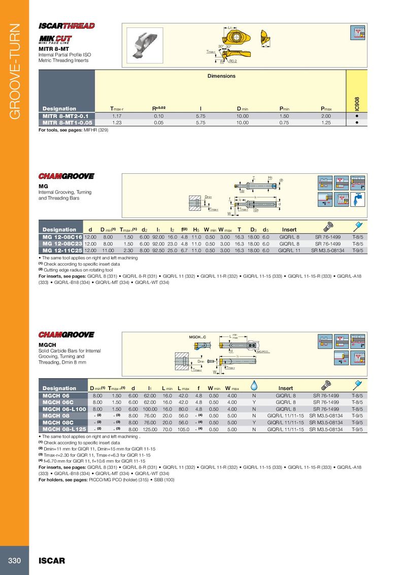 L5 30° 30° f MITR 8-MT Tmax-r Internal Partial Profile ISO Metric Threading Inserts R R0.2 Dimensions Designation T max-r R ±0.02 l D min P min P max IC908 GROOVE-TURN MITR 8-MT2-0.1 1.17 0.10 5.75 10.00 1.50 2.00 • MITR 8-MT1-0.05 1.23 0.05 5.75 10.00 0.75 1.25 • For tools, see pages: MIFHR (329) T H5 d5 MG Internal Grooving, Turning d2 and Threading Bars Dmin f l1 l2 d Tmax-r Tmax-r D3 W Designation d D min (1) T max-r (1) d 2 l 1 l 2 f (2) H 5 W min W max T D 3 d 5 Insert MG 12-08C16 12.00 8.00 1.50 6.00 92.00 16.0 4.8 11.0 0.50 3.00 16.3 18.00 6.0 GIQR/L 8 SR 76-1499 T-8/5 MG 12-08C23 12.00 8.00 1.50 6.00 92.00 23.0 4.8 11.0 0.50 3.00 16.3 18.00 6.0 GIQR/L 8 SR 76-1499 T-8/5 MG 12-11C25 12.00 11.00 2.30 8.00 92.50 25.0 6.7 11.0 0.50 3.00 16.3 18.00 6.0 GIQR/L 11 SR M3.5-08134 T-9/5 • The same tool applies on right and left machining (1) Check according to specific insert data (2) Cutting edge radius on rotating tool For inserts, see pages: GIQR/L 8 (331) • GIQR/L 8-R (331) • GIQR/L 11 (332) • GIQR/L 11-R (332) • GIQR/L 11-15 (333) • GIQR/L 11-15-R (333) • GIQR/L-A18 (333) • GIQR/L-B18 (334) • GIQR/L-MT (334) • GIQR/L-WT (334) MGCH...C L min max MGCH Solid Carbide Bars for Internal d MG PCO... Grooving, Turning and l1 Threading, Dmin 8 mm Dmin f Tmax-r Tmax-r W Designation D min (1) T max-r (1) d l 1 L min L max f W min W max Insert MGCH 06 8.00 1.50 6.00 62.00 16.0 42.0 4.8 0.50 4.00 N GIQR/L 8 SR 76-1499 T-8/5 MGCH 06C 8.00 1.50 6.00 62.00 16.0 42.0 4.8 0.50 4.00 Y GIQR/L 8 SR 76-1499 T-8/5 MGCH 06-L100 8.00 1.50 6.00 100.00 16.0 80.0 4.8 0.50 4.00 N GIQR/L 8 SR 76-1499 T-8/5 MGCH 08 - (2) - (3) 8.00 76.00 20.0 56.0 - (4) 0.50 5.00 N GIQR/L 11/11-15 SR M3.5-08134 T-9/5 MGCH 08C - (2) - (3) 8.00 76.00 20.0 56.0 - (4) 0.50 5.00 Y GIQR/L 11/11-15 SR M3.5-08134 T-9/5 MGCH 08-L125 - (2) - (3) 8.00 125.00 70.0 105.0 - (4) 0.50 5.00 N GIQR/L 11/11-15 SR M3.5-08134 T-9/5 • The same tool applies on right and left machining . (1) Check according to specific insert data (2) Dmin=11 mm for GIQR 11, Dmin=15 mm for GIQR 11-15 (3) Tmax-r=2.30 for GIQR 11, Tmax-r=6.3 for GIQR 11-15 (4) f=6.70 mm for GIQR 11, f=10.6 mm for GIQR 11-15 For inserts, see pages: GIQR/L 8 (331) • GIQR/L 8-R (331) • GIQR/L 11 (332) • GIQR/L 11-R (332) • GIQR/L 11-15 (333) • GIQR/L 11-15-R (333) • GIQR/L-A18 (333) • GIQR/L-B18 (334) • GIQR/L-MT (334) • GIQR/L-WT (334) For holders, see pages: PICCO/MG PCO (holder) (315) • SBB (100) 330 ISCAR