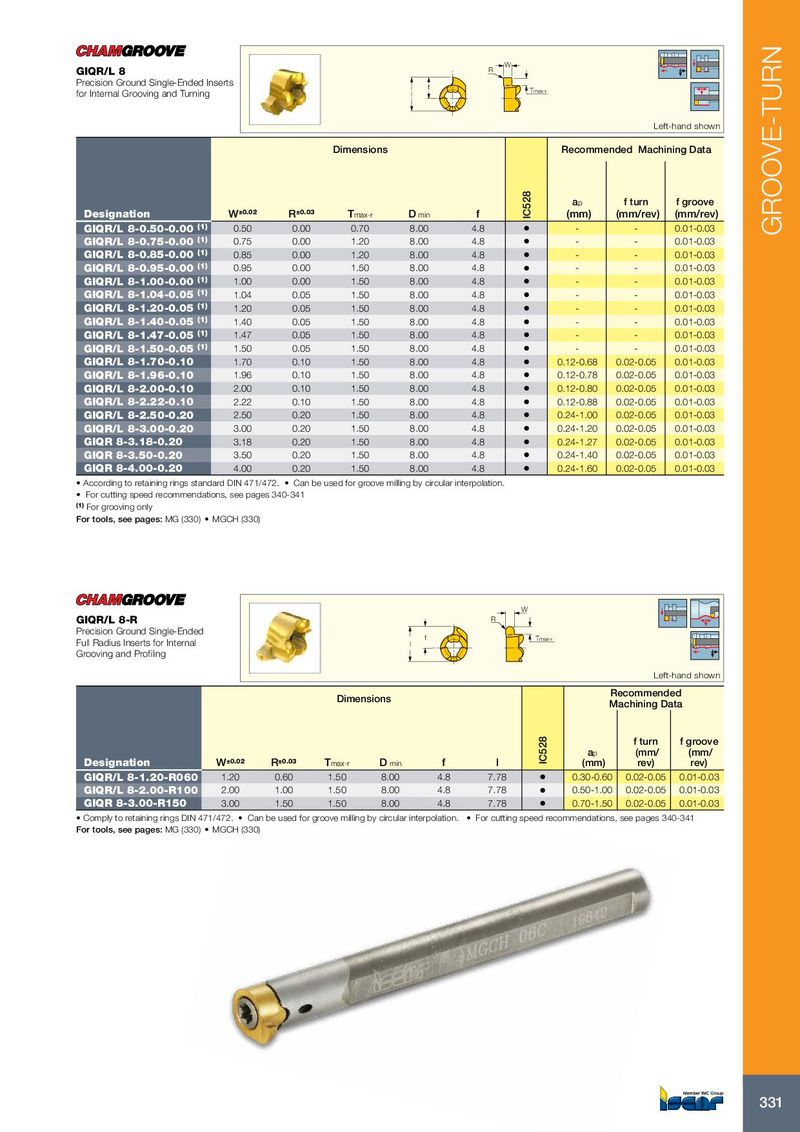 W GIQR/L 8 R Precision Ground Single-Ended Inserts f for Internal Grooving and Turning l Tmax-r Left-hand shown Dimensions Recommended Machining Data a p f turn f groove Designation W ±0.02 R ±0.03 T max-r D min f IC528 (mm) (mm/rev) (mm/rev) GIQR/L 8-0.50-0.00 (1) 0.50 0.00 0.70 8.00 4.8 • - - 0.01-0.03 GROOVE-TURN GIQR/L 8-0.75-0.00 (1) 0.75 0.00 1.20 8.00 4.8 • - - 0.01-0.03 GIQR/L 8-0.85-0.00 (1) 0.85 0.00 1.20 8.00 4.8 • - - 0.01-0.03 GIQR/L 8-0.95-0.00 (1) 0.95 0.00 1.50 8.00 4.8 • - - 0.01-0.03 GIQR/L 8-1.00-0.00 (1) 1.00 0.00 1.50 8.00 4.8 • - - 0.01-0.03 GIQR/L 8-1.04-0.05 (1) 1.04 0.05 1.50 8.00 4.8 • - - 0.01-0.03 GIQR/L 8-1.20-0.05 (1) 1.20 0.05 1.50 8.00 4.8 • - - 0.01-0.03 GIQR/L 8-1.40-0.05 (1) 1.40 0.05 1.50 8.00 4.8 • - - 0.01-0.03 GIQR/L 8-1.47-0.05 (1) 1.47 0.05 1.50 8.00 4.8 • - - 0.01-0.03 GIQR/L 8-1.50-0.05 (1) 1.50 0.05 1.50 8.00 4.8 • - - 0.01-0.03 GIQR/L 8-1.70-0.10 1.70 0.10 1.50 8.00 4.8 • 0.12-0.68 0.02-0.05 0.01-0.03 GIQR/L 8-1.96-0.10 1.96 0.10 1.50 8.00 4.8 • 0.12-0.78 0.02-0.05 0.01-0.03 GIQR/L 8-2.00-0.10 2.00 0.10 1.50 8.00 4.8 • 0.12-0.80 0.02-0.05 0.01-0.03 GIQR/L 8-2.22-0.10 2.22 0.10 1.50 8.00 4.8 • 0.12-0.88 0.02-0.05 0.01-0.03 GIQR/L 8-2.50-0.20 2.50 0.20 1.50 8.00 4.8 • 0.24-1.00 0.02-0.05 0.01-0.03 GIQR/L 8-3.00-0.20 3.00 0.20 1.50 8.00 4.8 • 0.24-1.20 0.02-0.05 0.01-0.03 GIQR 8-3.18-0.20 3.18 0.20 1.50 8.00 4.8 • 0.24-1.27 0.02-0.05 0.01-0.03 GIQR 8-3.50-0.20 3.50 0.20 1.50 8.00 4.8 • 0.24-1.40 0.02-0.05 0.01-0.03 GIQR 8-4.00-0.20 4.00 0.20 1.50 8.00 4.8 • 0.24-1.60 0.02-0.05 0.01-0.03 • According to retaining rings standard DIN 471/472. • Can be used for groove milling by circular interpolation. • For cutting speed recommendations, see pages 340-341 (1) For grooving only For tools, see pages: MG (330) • MGCH (330) W GIQR/L 8-R R Precision Ground Single-Ended f Tmax-r Full Radius Inserts for Internal l Grooving and Profiling Left-hand shown Recommended Dimensions Machining Data f turn f groove a p (mm/ (mm/ Designation W ±0.02 R ±0.03 T max-r D min f l IC528 (mm) rev) rev) GIQR/L 8-1.20-R060 1.20 0.60 1.50 8.00 4.8 7.78 • 0.30-0.60 0.02-0.05 0.01-0.03 GIQR/L 8-2.00-R100 2.00 1.00 1.50 8.00 4.8 7.78 • 0.50-1.00 0.02-0.05 0.01-0.03 GIQR 8-3.00-R150 3.00 1.50 1.50 8.00 4.8 7.78 • 0.70-1.50 0.02-0.05 0.01-0.03 • Comply to retaining rings DIN 471/472. • Can be used for groove milling by circular interpolation. • For cutting speed recommendations, see pages 340-341 For tools, see pages: MG (330) • MGCH (330) 331