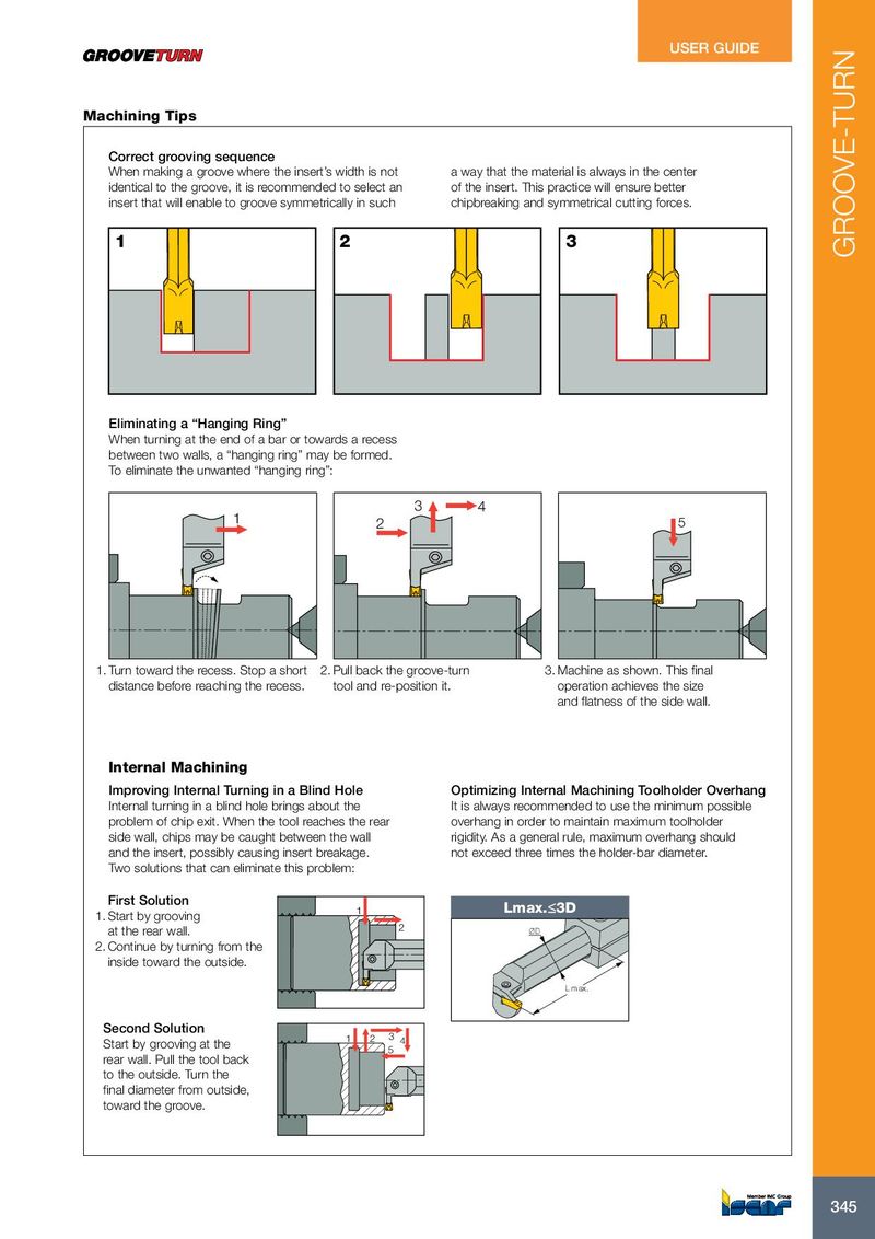 USER GUIDE Machining Tips Correct grooving sequence When making a groove where the insert’s width is not a way that the material is always in the center identical to the groove, it is recommended to select an of the insert. This practice will ensure better insert that will enable to groove symmetrically in such chipbreaking and symmetrical cutting forces. 1 2 3 GROOVE-TURN Eliminating a “Hanging Ring” When turning at the end of a bar or towards a recess between two walls, a “hanging ring” may be formed. To eliminate the unwanted “hanging ring”: 3 4 1 2 5 1. Turn toward the recess. Stop a short 2. Pull back the groove-turn 3. Machine as shown. This final distance before reaching the recess. tool and re-position it. operation achieves the size and flatness of the side wall. Internal Machining Improving Internal Turning in a Blind Hole Optimizing Internal Machining Toolholder Overhang Internal turning in a blind hole brings about the It is always recommended to use the minimum possible problem of chip exit. When the tool reaches the rear overhang in order to maintain maximum toolholder side wall, chips may be caught between the wall rigidity. As a general rule, maximum overhang should and the insert, possibly causing insert breakage. not exceed three times the holder-bar diameter. Two solutions that can eliminate this problem: First Solution 1 Lmax.≤3D 1. Start by grooving 2 at the rear wall. ØD 2. Continue by turning from the inside toward the outside. L max. Second Solution 1 2 3 Start by grooving at the 4 5 rear wall. Pull the tool back to the outside. Turn the final diameter from outside, toward the groove. 345 345