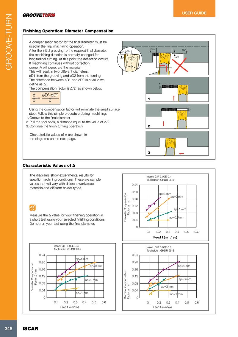 USER GUIDE Finishing Operation: Diameter Compensation A compensation factor for the final diameter must be used in the final machining operation. ØD 2 After the initial grooving to the required final diameter, ØD 1 ØD1 ØD2 the machining direction is normally changed for A Δ/2 longitudinal turning. At this point the deflection occurs. If machining continues without correction, corner A will penetrate the material. GROOVE-TURN This will result in two different diameters: øD1 from the grooving and øD2 from the turning. The difference between øD1 and øD2 is a value we define as ∆. a p The compensation factor is ∆/2, as shown below. 1 2 ∆ øD -øD = 1 2 2 Using the compensation factor will eliminate the small surface Δ/2 step. Follow this simple procedure during machining: 1. Groove to the final diameter 2. Pull the tool back, a distance equal to the value of ∆/2 3. Continue the finish turning operation 2 Characteristic values of ∆ are shown in the diagrams on the next page. 3 Characteristic Values of ∆ The diagrams show experimental results for Insert: GIP 3.00E-0.4 specific machining conditions. These are sample Toolholder: GHDR 25-3 values that will vary with different workpiece 0.24 materials and different holder types. 0.20 ap=3 mm ap=2 mm 0.16 0.12 ap=1 mm Factor ∆ mm 0.08 Measure the ∆ value for your finishing operation in ap=0.5 mm a short test using your selected finishing conditions. Diameter Compensation 0.04 Do not run your test using the final diameter. 0 0.1 0.2 0.3 0.4 0.5 0.6 Feed f (mm/rev) Insert: GIP 4.00E-0.4 Insert: GIP 6.00E-0.8 Toolholder: GHDR 25-4 Toolholder: GHDR 25-5 0.24 0.24 ap=4 mm 0.20 0.20 ap=3 mm ap=4 mm 0.16 0.16 0.12 0.12 ap=2 mm ap=3 mm Factor ∆ mm 0.08 0.08 ap=2 mm Diameter Compensation 0.04 0.04 ap=1 mm ap=1 mm 0 Diameter Compensation Factor ∆ mm 0 0.1 0.2 0.3 0.4 0.5 0.6 0.1 0.2 0.3 0.4 0.5 0.6 Feed f (mm/rev) Feed f (mm/rev) 346 346 ISCAR ISCAR