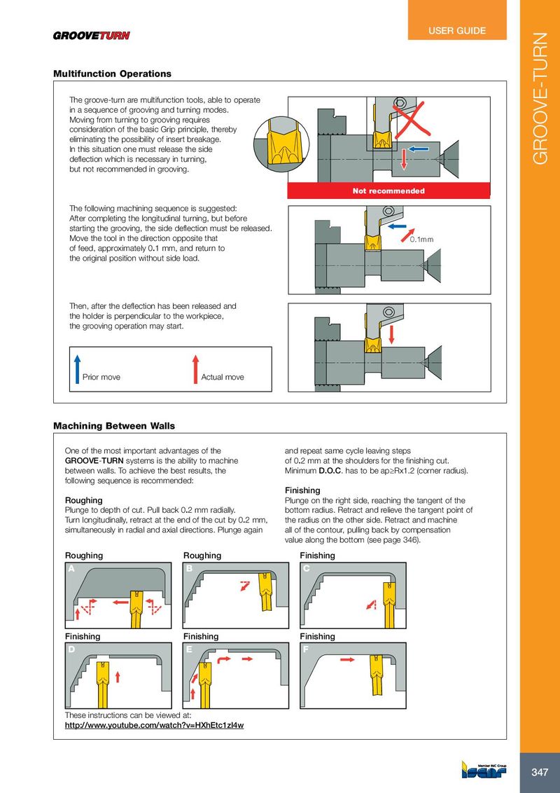 USER GUIDE Multifunction Operations The groove-turn are multifunction tools, able to operate in a sequence of grooving and turning modes. Moving from turning to grooving requires consideration of the basic Grip principle, thereby eliminating the possibility of insert breakage. In this situation one must release the side deflection which is necessary in turning, GROOVE-TURN but not recommended in grooving. Not recommended The following machining sequence is suggested: After completing the longitudinal turning, but before starting the grooving, the side deflection must be released. Move the tool in the direction opposite that 0.1mm of feed, approximately 0.1 mm, and return to the original position without side load. Then, after the deflection has been released and the holder is perpendicular to the workpiece, the grooving operation may start. Prior move Actual move Machining Between Walls One of the most important advantages of the and repeat same cycle leaving steps GROOVE-TURN systems is the ability to machine of 0.2 mm at the shoulders for the finishing cut. between walls. To achieve the best results, the Minimum D.O.C. has to be ap≥Rx1.2 (corner radius). following sequence is recommended: Finishing Roughing Plunge on the right side, reaching the tangent of the Plunge to depth of cut. Pull back 0.2 mm radially. bottom radius. Retract and relieve the tangent point of Turn longitudinally, retract at the end of the cut by 0.2 mm, the radius on the other side. Retract and machine simultaneously in radial and axial directions. Plunge again all of the contour, pulling back by compensation value along the bottom (see page 346). Roughing Roughing Finishing A B C Finishing Finishing Finishing D E F These instructions can be viewed at: http://www.youtube.com/watch?v=HXhEtc1zl4w 347 347