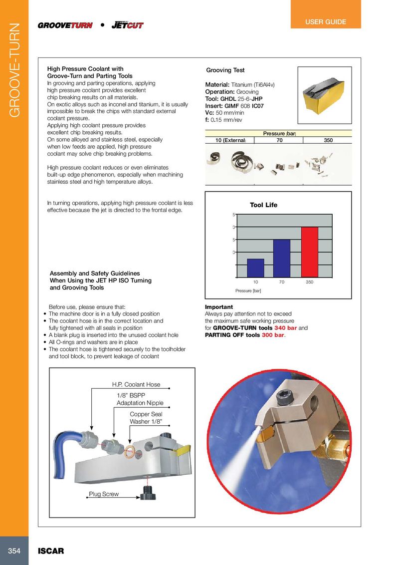 USER GUIDE • High Pressure Coolant with Grooving Test Groove-Turn and Parting Tools In grooving and parting operations, applying Material: Titanium (Ti6Al4v) high pressure coolant provides excellent Operation: Grooving chip breaking results on all materials. Tool: GHDL 25-6-JHP On exotic alloys such as inconel and titanium, it is usually Insert: GIMF 608 IC07 impossible to break the chips with standard external Vc: 50 mm/min GROOVE-TURN coolant pressure. f: 0.15 mm/rev Applying high coolant pressure provides excellent chip breaking results. Pressure [ bar ] On some alloyed and stainless steel, especially 10 (External ) 70 350 when low feeds are applied, high pressure coolant may solve chip breaking problems. High pressure coolant reduces or even eliminates built-up edge phenomenon, especially when machining stainless steel and high temperature alloys. In turning operations, applying high pressure coolant is less Tool Life effective because the jet is directed to the frontal edge. 25 20 15 10 Grooves 5 Assembly and Safety Guidelines 0 When Using the JET HP ISO Turning 10 70 350 and Grooving Tools Pressure [bar] Before use, please ensure that: Important • The machine door is in a fully closed position Always pay attention not to exceed • The coolant hose is in the correct location and the maximum safe working pressure fully tightened with all seals in position for GROOVE-TURN tools 340 bar and • A blank plug is inserted into the unused coolant hole PARTING OFF tools 300 bar. • All O-rings and washers are in place • The coolant hose is tightened securely to the toolholder and tool block, to prevent leakage of coolant H.P. Coolant Hose 1/8” BSPP Adaptation Nipple Copper Seal Washer 1/8” Plug Screw 354 354 ISCAR ISCAR