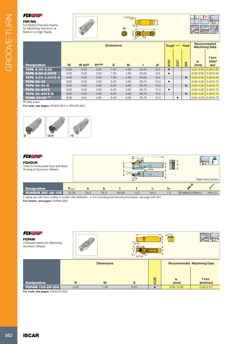 ±0.025 FSP/MA S Full Radius Precision Inserts a° for Machining Aluminum at YZ l Medium to High Feeds W R M Recommended Dimensions Tough 1 Hard Machining Data f turn a p (mm/ Designation W W tol (±) R ±0.05 S M l a° IC20 IC07 ID5 (mm) rev) GROOVE-TURN FSPA 6.00-3.00 6.00 0.02 3.00 7.50 4.60 25.00 9.0 • 0.05-3.00 0.30-0.55 FSPA 6.00-3.00YZ 6.00 0.02 3.00 7.50 4.60 25.00 9.0 • 0.05-3.00 0.30-0.55 FSPA 6.00-3.00YZ-D 6.00 0.02 3.00 7.50 4.60 25.00 9.0 • 0.05-3.00 0.30-0.55 FSPA 80-40 8.00 0.02 4.00 8.40 5.60 29.70 10.0 • 0.05-4.00 0.40-0.72 FSPA 80-40-D 8.00 0.02 4.00 8.40 5.60 29.70 10.0 • 0.05-4.00 0.40-0.72 FSPA 80-40YZ 8.00 0.02 4.00 8.40 5.60 29.70 10.0 • 0.05-4.00 0.40-0.72 FSPA 80-40YZ-D 8.00 0.02 4.00 8.40 5.60 29.70 10.0 • 0.05-4.00 0.40-0.72 FSMA 80-40 (1) 8.00 0.04 4.00 8.40 5.60 29.70 10.0 • 0.05-4.00 0.40-0.72 (1) Utility insert For tools, see pages: FSHDR (361) • FSHIUR (360) l1 l2 FGHDUR Tools for Interrupted Cuts and Back h h 45° Turning of Aluminum Wheels h 4 8 f Tmax-r b 62° Right-hand shown Designation T max-r h b l 1 f l 2 h 4 FGHDUR 25C-3A-10S 22.30 25.0 25.0 150.00 13.3 54.4 7.0 SR M6X25 DIN912 HW 5.0 • Upper jaw with hard coating to sustain chip deflection • For mounting and removing the inserts, see page 340-351 For inserts, see pages: FGPAM (362) 10° l FGPAM S V-Shaped Inserts for Machining 10° Aluminum Wheels 11.8 4.5 M R 25° 10 Dimensions Recommended Machining Data a p f turn Designation R M S IC20 (mm) (mm/rev) FGPAM 10S-3R-25A 3.00 7.00 8.20 • 0.05-12.00 0.40-0.72 For tools, see pages: FGHDUR (362) 362 ISCAR
