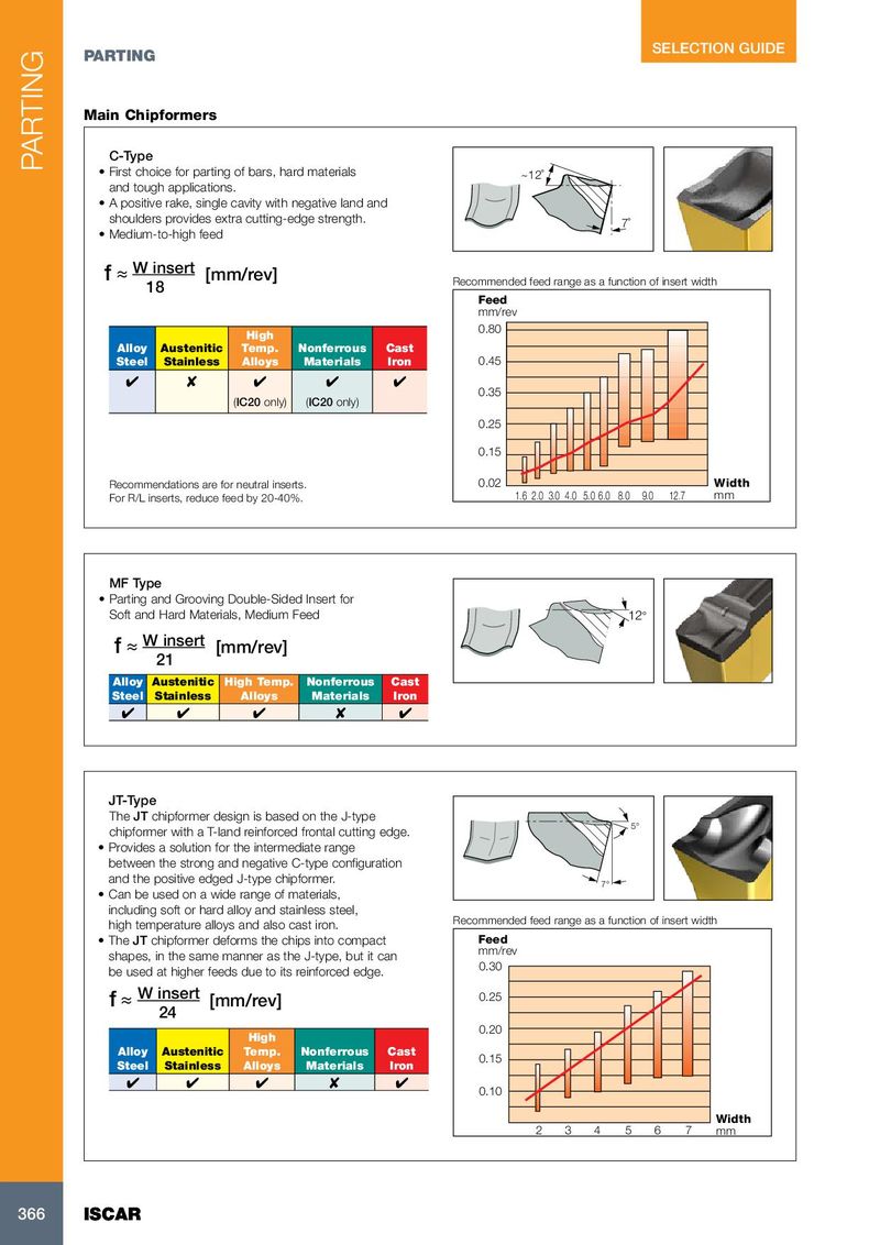 SELECTION GUIDE PARTING Main Chipformers C-Type PARTING • First choice for parting of bars, hard materials ~12˚ and tough applications. • A positive rake, single cavity with negative land and shoulders provides extra cutting-edge strength. 7˚ • Medium-to-high feed W insert f ≈ [mm/rev] Recommended feed range as a function of insert width 18 Feed mm/rev 0.80 High Alloy Austenitic Temp. Nonferrous Cast Steel Stainless Alloys Materials Iron 0.45 ✔ ✘ ✔ ✔ ✔ 0.35 (IC20 only) (IC20 only) 0.25 0.15 Recommendations are for neutral inserts. 0.02 Width For R/L inserts, reduce feed by 20-40%. 1.6 2.0 3.0 4.0 5.0 6.0 8.0 9.0 12.7 mm MF Type • Parting and Grooving Double-Sided Insert for Soft and Hard Materials, Medium Feed 12° W insert f ≈ [mm/rev] 21 Alloy Austenitic High Temp. Nonferrous Cast Steel Stainless Alloys Materials Iron ✔ ✔ ✔ ✘ ✔ JT-Type The JT chipformer design is based on the J-type 5° chipformer with a T-land reinforced frontal cutting edge. • Provides a solution for the intermediate range between the strong and negative C-type configuration and the positive edged J-type chipformer. 7° • Can be used on a wide range of materials, including soft or hard alloy and stainless steel, Recommended feed range as a function of insert width high temperature alloys and also cast iron. • The JT chipformer deforms the chips into compact Feed mm/rev shapes, in the same manner as the J-type, but it can 0.30 be used at higher feeds due to its reinforced edge. W insert 0.25 f ≈ [mm/rev] 24 0.20 High Alloy Austenitic Temp. Nonferrous Cast 0.15 Steel Stainless Alloys Materials Iron ✔ ✔ ✔ ✘ ✔ 0.10 Width 2 3 4 5 6 7 mm 366 366 ISCAR ISCAR