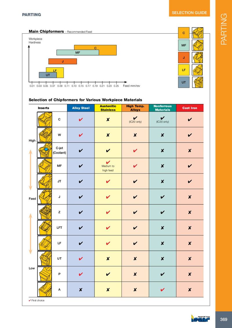SELECTION GUIDE PARTING Main Chipformers - Recommended Feed C Workpiece Hardness PARTING MF C MF J J LF LF UT UT 0.01 0.03 0.05 0.07 0.09 0.11 0.13 0.15 0.17 0.19 0.21 0.23 0.25 Feed mm/rev Selection of Chipformers for Various Workpiece Materials Austenitic High Temp. Nonferrous Inserts Alloy Steel Cast Iron Stainless Alloys Materials C ✔ ✔ ✔ ✘ ✔ (IC20 only) (IC20 only) W ✔ ✘ ✘ ✘ ✔ High C-jet ✔ ✔ ✔ ✘ ✘ (Coolant) ✔ MF ✔ Medium to ✔ ✘ ✔ high feed JT ✔ ✔ ✔ ✘ ✔ J Feed ✔ ✔ ✔ ✔ ✘ Z ✔ ✔ ✔ ✔ ✘ LFT ✔ ✔ ✔ ✘ ✘ LF ✔ ✔ ✔ ✘ ✘ UT ✔ ✘ ✘ ✘ ✘ Low P ✔ ✔ ✘ ✔ ✘ A ✘ ✘ ✘ ✔ ✘ ✔ First choice 369 369