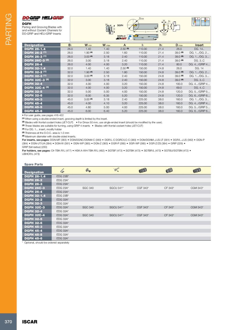 Dmax W h1 DGFH W DGFH Parting and Grooving Blades with B1 D and without Coolant Channels for l1 A DO-GRIP and HELI-GRIP Inserts 150° DGFH-C PARTING Designation B 1 W min W max A l 1 h 1 D max Insert DGFH 26-1.4 26.0 1.40 1.40 2.50 (5) 110.00 21.4 26.0 DG. 14.. DGFH 26-2 (1) 26.0 1.90 (4) 2.50 1.60 110.00 21.4 39.0 (6) DG. 1.../DG. 2... DGFH 26-3 (1) 26.0 3.00 (4) 3.18 2.40 110.00 21.4 39.0 (6) DG. 1.../DG. 3... DGFH 26C-3 (2) 26.0 3.00 3.18 2.40 110.00 21.4 39.0 (6) DG. 3..C DGFH 26-4 26.0 4.00 4.00 3.20 110.00 21.4 80.0 DG. 4.../GRIP 4... DGFH 32-1.4 32.0 1.40 1.40 2.50 (5) 150.00 24.8 26.0 DG. 14 DGFH 32-2 (1) 32.0 1.90 (4) 2.50 1.80 150.00 24.8 39.0 (6) DG. 1.../DG. 2... DGFH 32-3 (1) 32.0 3.00 (4) 3.18 2.40 150.00 24.8 39.0 (6) DG. 1.../DG. 3... DGFH 32C-3 (2) 32.0 3.00 3.18 2.40 150.00 24.8 39.0 (6) DG. 3..C DGFH 32-4 32.0 4.00 4.00 3.20 150.00 24.8 100.0 DG. 4.../GRIP 4... DGFH 32C-4 (3) 32.0 4.00 4.00 3.20 150.00 24.8 69.0 DG. 4..C DGFH 32-5 32.0 5.00 5.00 4.00 150.00 24.8 120.0 DG. 5.../GRIP 5... DGFH 32-6 32.0 6.00 6.35 5.20 150.00 24.8 120.0 DG. 6.../GRIP 6... DGFH 45-3 45.0 3.00 (4) 3.18 2.40 225.00 38.0 160.0 DG. 1.../DG. 3... DGFH 45-4 45.0 4.00 4.10 3.20 225.00 38.0 160.0 DG. 4.../GRIP 4... DGFH 45-5 45.0 4.80 5.00 4.00 225.00 38.0 160.0 DG. 5.../GRIP 5... DGFH 45-6 45.0 6.00 6.40 5.20 225.00 38.0 160.0 DG. 6.../GRIP 6... • For user guide, see pages 416-422 (1) When using a double-ended insert, grooving depth is limited by the insert. (2) Blades with frontal coolant holes (JET-CUT) • For Dmax 50 mm, use single-ended insert (should be modified by the user). (3) These blades are suitable for turning, using GRIP 4 inserts • Blades with frontal coolant holes (JET-CUT) (4) For DG. 1... insert, modify holder (5) Thickness at the D.O.C. area is 1.0 mm (6) Maximum diameter with double-sided inserts. For inserts, see pages: DGN-MF (383) • DGN/DGNC/DGNM-C (380) • DGR/L-C DGRC/LC-C (380) • DGN/DGNM-J/JS/JT (381) • DGR/L-J/JS (382) • DGN-P (384) • DGN-UT/UA (384) • DGN-W (381) • DGN-WP (385) • DGN-Z (383) • DGR-P (385) • DGR-WP (385) • DGR-Z/ZS (384) • GRIP (229) • GRIP (full radius) (230) For holders, see pages: C#-TBK-R/L (477) • HSK A-WH-TBK-R/L (482) • SGTBF (473) • SGTBK (473) • SGTBR/L (473) • SGTBU/SGTBN (472) • UBHCR/L (473) Spare Parts Designation DGFH 26-1.4 EDG 23B* DGFH 26-2 EDG 23A* DGFH 26-3 EDG 23A* DGFH 26C-3 EDG 23A* SGC 340 SGCU 341* CGF 343* CF 343* CGM 343* DGFH 26-4 EDG 23A* DGFH 32-1.4 EDG 23B* DGFH 32-2 EDG 33A* DGFH 32-3 EDG 33A* DGFH 32C-3 EDG 33A* SGC 340 SGCU 341* CGF 343* CF 343* CGM 343* DGFH 32-4 EDG 33A* DGFH 32C-4 EDG 33A* SGC 340 SGCU 341* CGF 343* CF 343* CGM 343* DGFH 32-5 EDG 33A* DGFH 32-6 EDG 33A* DGFH 45-3 EDG 33A* DGFH 45-4 EDG 33A* DGFH 45-5 EDG 33A* DGFH 45-6 EDG 33A* * Optional, should be ordered separately 370 ISCAR