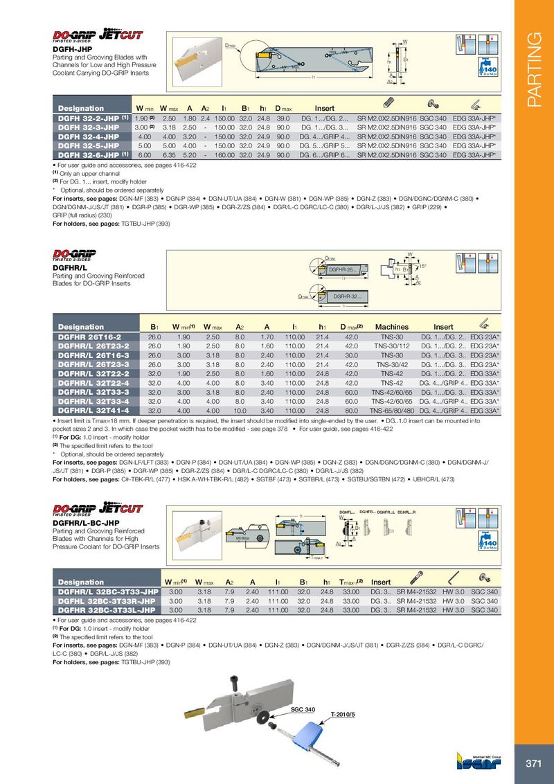 W Dmax DGFH-JHP Max. Min. Parting and Grooving Blades with h1 B1 Channels for Low and High Pressure Min. Max. Coolant Carrying DO-GRIP Inserts Bar Max l1 A A2 PARTING Designation W min W max A A 2 l 1 B 1 h 1 D max Insert DGFH 32-2-JHP (1) 1.90 (2) 2.50 1.80 2.4 150.00 32.0 24.8 39.0 DG. 1.../DG. 2... SR M2.0X2.5DIN916 SGC 340 EDG 33A-JHP* DGFH 32-3-JHP 3.00 (2) 3.18 2.50 - 150.00 32.0 24.8 90.0 DG. 1.../DG. 3... SR M2.0X2.5DIN916 SGC 340 EDG 33A-JHP* DGFH 32-4-JHP 4.00 4.00 3.20 - 150.00 32.0 24.9 90.0 DG. 4.../GRIP 4... SR M2.0X2.5DIN916 SGC 340 EDG 33A-JHP* DGFH 32-5-JHP 5.00 5.00 4.00 - 150.00 32.0 24.9 90.0 DG. 5.../GRIP 5... SR M2.0X2.5DIN916 SGC 340 EDG 33A-JHP* DGFH 32-6-JHP (1) 6.00 6.35 5.20 - 160.00 32.0 24.9 90.0 DG. 6.../GRIP 6... SR M2.0X2.5DIN916 SGC 340 EDG 33A-JHP* • For user guide and accessories, see pages 416-422 (1) Only an upper channel (2) For DG. 1... insert, modify holder * Optional, should be ordered separately For inserts, see pages: DGN-MF (383) • DGN-P (384) • DGN-UT/UA (384) • DGN-W (381) • DGN-WP (385) • DGN-Z (383) • DGN/DGNC/DGNM-C (380) • DGN/DGNM-J/JS/JT (381) • DGR-P (385) • DGR-WP (385) • DGR-Z/ZS (384) • DGR/L-C DGRC/LC-C (380) • DGR/L-J/JS (382) • GRIP (229) • GRIP (full radius) (230) For holders, see pages: TGTBU-JHP (393) W Dmax 15° DGFHR/L DGFHR-26... h1 B1 Parting and Grooving Reinforced l1 A Blades for DO-GRIP Inserts A2 Dmax DGFHR-32... l1 Designation B 1 W min (1) W max A 2 A l 1 h 1 D max (2) Machines Insert DGFHR 26T16-2 26.0 1.90 2.50 8.0 1.70 110.00 21.4 42.0 TNS-30 DG. 1.../DG. 2.. EDG 23A* DGFHR/L 26T23-2 26.0 1.90 2.50 8.0 1.60 110.00 21.4 42.0 TNS-30/112 DG. 1.../DG. 2.. EDG 23A* DGFHR/L 26T16-3 26.0 3.00 3.18 8.0 2.40 110.00 21.4 30.0 TNS-30 DG. 1.../DG. 3.. EDG 23A* DGFHR/L 26T23-3 26.0 3.00 3.18 8.0 2.40 110.00 21.4 42.0 TNS-30/42 DG. 1.../DG. 3.. EDG 23A* DGFHR/L 32T22-2 32.0 1.90 2.50 8.0 1.60 110.00 24.8 42.0 TNS-42 DG. 1.../DG. 2.. EDG 33A* DGFHR/L 32T22-4 32.0 4.00 4.00 8.0 3.40 110.00 24.8 42.0 TNS-42 DG. 4.../GRIP 4.. EDG 33A* DGFHR/L 32T33-3 32.0 3.00 3.18 8.0 2.40 110.00 24.8 60.0 TNS-42/60/65 DG. 1.../DG. 3.. EDG 33A* DGFHR/L 32T33-4 32.0 4.00 4.00 8.0 3.40 110.00 24.8 60.0 TNS-42/60/65 DG. 4.../GRIP 4.. EDG 33A* DGFHR/L 32T41-4 32.0 4.00 4.00 10.0 3.40 110.00 24.8 80.0 TNS-65/80/480 DG. 4.../GRIP 4.. EDG 33A* • Insert limit is Tmax=18 mm. If deeper penetration is required, the insert should be modified into single-ended by the user. • DG..1.0 insert can be mounted into pocket sizes 2 and 3. In which case the pocket width has to be modified - see page 378 • For user guide, see pages 416-422 (1) For DG: 1.0 insert - modify holder (2) The specified limit refers to the tool * Optional, should be ordered separately For inserts, see pages: DGN-LF/LFT (383) • DGN-P (384) • DGN-UT/UA (384) • DGN-WP (385) • DGN-Z (383) • DGN/DGNC/DGNM-C (380) • DGN/DGNM-J/ JS/JT (381) • DGR-P (385) • DGR-WP (385) • DGR-Z/ZS (384) • DGR/L-C DGRC/LC-C (380) • DGR/L-J/JS (382) For holders, see pages: C#-TBK-R/L (477) • HSK A-WH-TBK-R/L (482) • SGTBF (473) • SGTBR/L (473) • SGTBU/SGTBN (472) • UBHCR/L (473) DGHFL... DGHFR... DGHFR...L DGHFL...R l1 W DGFHR/L-BC-JHP Parting and Grooving Reinforced h1 B1 Blades with Channels for High MinMax A A2 Pressure Coolant for DO-GRIP Inserts Bar Max Tmax-r Designation W min (1) W max A 2 A l 1 B 1 h 1 T max-r (2) Insert DGFHR/L 32BC-3T33-JHP 3.00 3.18 7.9 2.40 111.00 32.0 24.8 33.00 DG. 3.. SR M4-21532 HW 3.0 SGC 340 DGFHL 32BC-3T33R-JHP 3.00 3.18 7.9 2.40 111.00 32.0 24.8 33.00 DG. 3.. SR M4-21532 HW 3.0 SGC 340 DGFHR 32BC-3T33L-JHP 3.00 3.18 7.9 2.40 111.00 32.0 24.8 33.00 DG. 3.. SR M4-21532 HW 3.0 SGC 340 • For user guide and accessories, see pages 416-422 (1) For DG: 1.0 insert - modify holder (2) The specified limit refers to the tool For inserts, see pages: DGN-MF (383) • DGN-P (384) • DGN-UT/UA (384) • DGN-Z (383) • DGN/DGNM-J/JS/JT (381) • DGR-Z/ZS (384) • DGR/L-C DGRC/ LC-C (380) • DGR/L-J/JS (382) For holders, see pages: TGTBU-JHP (393) SGC 340 T-2010/5 371