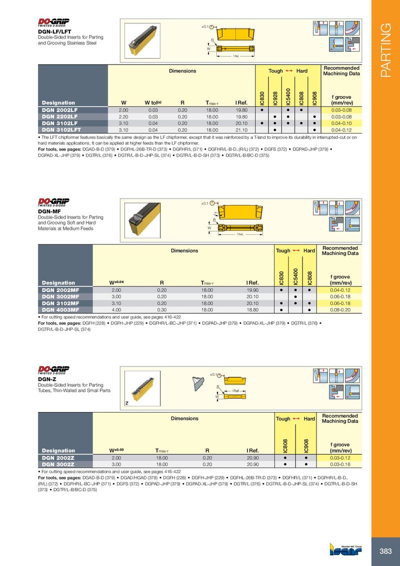 ±0.1 DGN-LF/LFT Double-Sided Inserts for Parting R and Grooving Stainless Steel W l Ref. Recommended Dimensions Tough 1 Hard Machining Data PARTING f groove Designation W W tol (±) R T max-r l Ref. IC830 IC928 IC5400 IC808 IC908 (mm/rev) DGN 2002LF 2.00 0.03 0.20 18.00 19.80 • • • 0.03-0.08 DGN 2202LF 2.20 0.03 0.20 18.00 19.80 • • • 0.03-0.08 DGN 3102LF 3.10 0.04 0.20 18.00 20.10 • • • • • 0.04-0.10 DGN 3102LFT 3.10 0.04 0.20 18.00 21.10 • • 0.04-0.12 • The LFT chipformer features basically the same design as the LF chipformer, except that it was reinforced by a T-land to improve its durability in interrupted-cut or on hard materials applications. It can be applied at higher feeds than the LF chipformer. For tools, see pages: DGAD-B-D (379) • DGFHL-26B-TR-D (373) • DGFHR/L (371) • DGFHR/L-B-D..(R/L) (372) • DGFS (372) • DGPAD-JHP (379) • DGPAD-XL-JHP (379) • DGTR/L (376) • DGTR/L-B-D-JHP-SL (374) • DGTR/L-B-D-SH (373) • DGTR/L-B/BC-D (375) ±0.1 DGN-MF 7° Double-Sided Inserts for Parting R and Grooving Soft and Hard Materials at Medium Feeds W l Ref. Recommended Dimensions Tough 1 Hard Machining Data f groove Designation W ±0.04 R T max-r l Ref. IC830 IC5400 IC808 (mm/rev) DGN 2002MF 2.00 0.20 18.00 19.90 • • • 0.04-0.12 DGN 3002MF 3.00 0.20 18.00 20.10 • 0.06-0.18 DGN 3102MF 3.10 0.20 18.00 20.10 • • • 0.06-0.18 DGN 4003MF 4.00 0.30 18.00 18.80 • • 0.08-0.20 • For cutting speed recommendations and user guide, see pages 416-422 For tools, see pages: DGFH (228) • DGFH-JHP (229) • DGFHR/L-BC-JHP (371) • DGPAD-JHP (379) • DGPAD-XL-JHP (379) • DGTR/L (376) • DGTR/L-B-D-JHP-SL (374) ±0.1 DGN-Z Double-Sided Inserts for Parting R Tubes, Thin-Walled and Small Parts l Ref W Recommended Dimensions Tough 1 Hard Machining Data f groove Designation W ±0.03 T max-r R l Ref. IC808 IC908 (mm/rev) DGN 2002Z 2.00 18.00 0.20 20.90 • • 0.03-0.12 DGN 3002Z 3.00 18.00 0.20 20.90 • • 0.03-0.16 • For cutting speed recommendations and user guide, see pages 416-422 For tools, see pages: DGAD-B-D (379) • DGAD/HGAD (378) • DGFH (228) • DGFH-JHP (229) • DGFHL-26B-TR-D (373) • DGFHR/L (371) • DGFHR/L-B-D.. (R/L) (372) • DGFHR/L-BC-JHP (371) • DGFS (372) • DGPAD-JHP (379) • DGPAD-XL-JHP (379) • DGTR/L (376) • DGTR/L-B-D-JHP-SL (374) • DGTR/L-B-D-SH (373) • DGTR/L-B/BC-D (375) 383