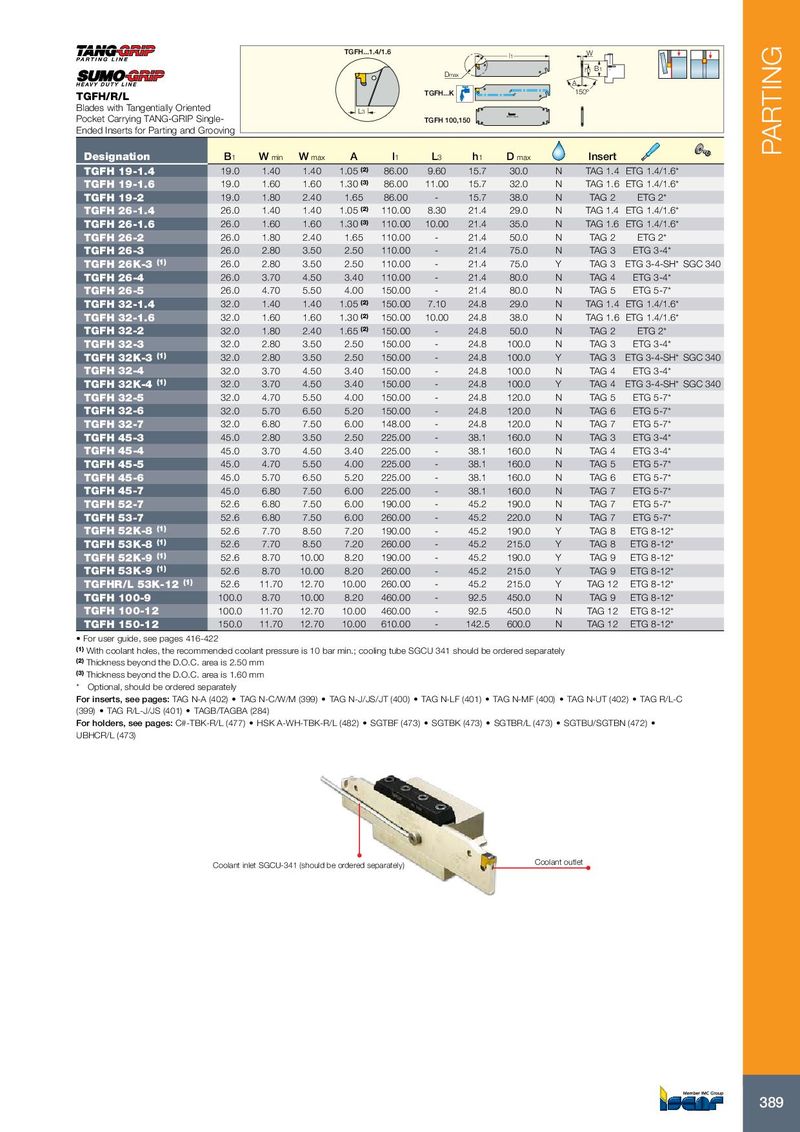 TGFH...1.4/1.6 l1 W h1 B1 Dmax A TGFH...K 150º TGFH/R/L Blades with Tangentially Oriented L3 TGFH 100-9 Pocket Carrying TANG-GRIP Single- TGFH 100,150 Ended Inserts for Parting and Grooving PARTING Designation B 1 W min W max A l 1 L 3 h 1 D max Insert TGFH 19-1.4 19.0 1.40 1.40 1.05 (2) 86.00 9.60 15.7 30.0 N TAG 1.4 ETG 1.4/1.6* TGFH 19-1.6 19.0 1.60 1.60 1.30 (3) 86.00 11.00 15.7 32.0 N TAG 1.6 ETG 1.4/1.6* TGFH 19-2 19.0 1.80 2.40 1.65 86.00 - 15.7 38.0 N TAG 2 ETG 2* TGFH 26-1.4 26.0 1.40 1.40 1.05 (2) 110.00 8.30 21.4 29.0 N TAG 1.4 ETG 1.4/1.6* TGFH 26-1.6 26.0 1.60 1.60 1.30 (3) 110.00 10.00 21.4 35.0 N TAG 1.6 ETG 1.4/1.6* TGFH 26-2 26.0 1.80 2.40 1.65 110.00 - 21.4 50.0 N TAG 2 ETG 2* TGFH 26-3 26.0 2.80 3.50 2.50 110.00 - 21.4 75.0 N TAG 3 ETG 3-4* TGFH 26K-3 (1) 26.0 2.80 3.50 2.50 110.00 - 21.4 75.0 Y TAG 3 ETG 3-4-SH* SGC 340 TGFH 26-4 26.0 3.70 4.50 3.40 110.00 - 21.4 80.0 N TAG 4 ETG 3-4* TGFH 26-5 26.0 4.70 5.50 4.00 150.00 - 21.4 80.0 N TAG 5 ETG 5-7* TGFH 32-1.4 32.0 1.40 1.40 1.05 (2) 150.00 7.10 24.8 29.0 N TAG 1.4 ETG 1.4/1.6* TGFH 32-1.6 32.0 1.60 1.60 1.30 (2) 150.00 10.00 24.8 38.0 N TAG 1.6 ETG 1.4/1.6* TGFH 32-2 32.0 1.80 2.40 1.65 (2) 150.00 - 24.8 50.0 N TAG 2 ETG 2* TGFH 32-3 32.0 2.80 3.50 2.50 150.00 - 24.8 100.0 N TAG 3 ETG 3-4* TGFH 32K-3 (1) 32.0 2.80 3.50 2.50 150.00 - 24.8 100.0 Y TAG 3 ETG 3-4-SH* SGC 340 TGFH 32-4 32.0 3.70 4.50 3.40 150.00 - 24.8 100.0 N TAG 4 ETG 3-4* TGFH 32K-4 (1) 32.0 3.70 4.50 3.40 150.00 - 24.8 100.0 Y TAG 4 ETG 3-4-SH* SGC 340 TGFH 32-5 32.0 4.70 5.50 4.00 150.00 - 24.8 120.0 N TAG 5 ETG 5-7* TGFH 32-6 32.0 5.70 6.50 5.20 150.00 - 24.8 120.0 N TAG 6 ETG 5-7* TGFH 32-7 32.0 6.80 7.50 6.00 148.00 - 24.8 120.0 N TAG 7 ETG 5-7* TGFH 45-3 45.0 2.80 3.50 2.50 225.00 - 38.1 160.0 N TAG 3 ETG 3-4* TGFH 45-4 45.0 3.70 4.50 3.40 225.00 - 38.1 160.0 N TAG 4 ETG 3-4* TGFH 45-5 45.0 4.70 5.50 4.00 225.00 - 38.1 160.0 N TAG 5 ETG 5-7* TGFH 45-6 45.0 5.70 6.50 5.20 225.00 - 38.1 160.0 N TAG 6 ETG 5-7* TGFH 45-7 45.0 6.80 7.50 6.00 225.00 - 38.1 160.0 N TAG 7 ETG 5-7* TGFH 52-7 52.6 6.80 7.50 6.00 190.00 - 45.2 190.0 N TAG 7 ETG 5-7* TGFH 53-7 52.6 6.80 7.50 6.00 260.00 - 45.2 220.0 N TAG 7 ETG 5-7* TGFH 52K-8 (1) 52.6 7.70 8.50 7.20 190.00 - 45.2 190.0 Y TAG 8 ETG 8-12* TGFH 53K-8 (1) 52.6 7.70 8.50 7.20 260.00 - 45.2 215.0 Y TAG 8 ETG 8-12* TGFH 52K-9 (1) 52.6 8.70 10.00 8.20 190.00 - 45.2 190.0 Y TAG 9 ETG 8-12* TGFH 53K-9 (1) 52.6 8.70 10.00 8.20 260.00 - 45.2 215.0 Y TAG 9 ETG 8-12* TGFHR/L 53K-12 (1) 52.6 11.70 12.70 10.00 260.00 - 45.2 215.0 Y TAG 12 ETG 8-12* TGFH 100-9 100.0 8.70 10.00 8.20 460.00 - 92.5 450.0 N TAG 9 ETG 8-12* TGFH 100-12 100.0 11.70 12.70 10.00 460.00 - 92.5 450.0 N TAG 12 ETG 8-12* TGFH 150-12 150.0 11.70 12.70 10.00 610.00 - 142.5 600.0 N TAG 12 ETG 8-12* • For user guide, see pages 416-422 (1) With coolant holes, the recommended coolant pressure is 10 bar min.; cooling tube SGCU 341 should be ordered separately (2) Thickness beyond the D.O.C. area is 2.50 mm (3) Thickness beyond the D.O.C. area is 1.60 mm * Optional, should be ordered separately For inserts, see pages: TAG N-A (402) • TAG N-C/W/M (399) • TAG N-J/JS/JT (400) • TAG N-LF (401) • TAG N-MF (400) • TAG N-UT (402) • TAG R/L-C (399) • TAG R/L-J/JS (401) • TAGB/TAGBA (284) For holders, see pages: C#-TBK-R/L (477) • HSK A-WH-TBK-R/L (482) • SGTBF (473) • SGTBK (473) • SGTBR/L (473) • SGTBU/SGTBN (472) • UBHCR/L (473) Coolant inlet SGCU-341 (should be ordered separately) Coolant outlet 389