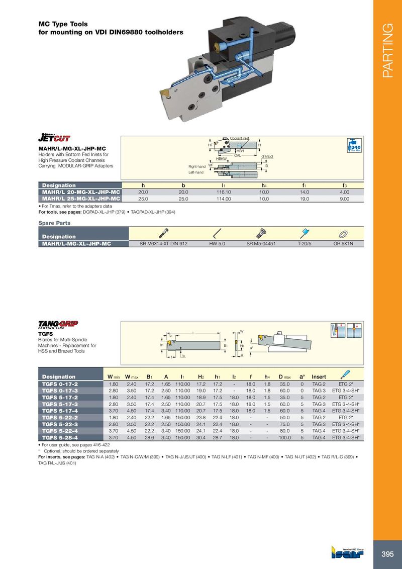 MC Type Tools for mounting on VDI DIN69880 toolholders PARTING Coolant inlet HF H MAHR/L-MG-XL-JHP-MC HBH Bar Max Holders with Bottom Fed Inlets for OAL G1/8x3 High Pressure Coolant Channels HBKW Carrying MODULAR-GRIP Adapters Right-hand WF B Left-hand Designation h b l 1 h 4 f 1 f 3 MAHR/L 20-MG-XL-JHP-MC 20.0 20.0 116.10 10.0 14.0 4.00 MAHR/L 25-MG-XL-JHP-MC 25.0 25.0 114.00 10.0 19.0 9.00 • For Tmax, refer to the adapters data For tools, see pages: DGPAD-XL-JHP (379) • TAGPAD-XL-JHP (394) Spare Parts Designation MAHR/L-MG-XL-JHP-MC SR M6X14-XT DIN 912 HW 5.0 SR M5-04451 T-20/5 OR 5X1N TGFS l1 W l2 Blades for Multi-Spindle Machines - Replacement for h1 B1 H2 a° HSS and Brazed Tools A f h4 Designation W min W max B 1 A l 1 H 2 h 1 l 2 f h 4 D max a° Insert TGFS 0-17-2 1.80 2.40 17.2 1.65 110.00 17.2 17.2 - 18.0 1.8 35.0 0 TAG 2 ETG 2* TGFS 0-17-3 2.80 3.50 17.2 2.50 110.00 19.0 17.2 - 18.0 1.8 60.0 0 TAG 3 ETG 3-4-SH* TGFS 5-17-2 1.80 2.40 17.4 1.65 110.00 18.9 17.5 18.0 18.0 1.5 35.0 5 TAG 2 ETG 2* TGFS 5-17-3 2.80 3.50 17.4 2.50 110.00 20.7 17.5 18.0 18.0 1.5 60.0 5 TAG 3 ETG 3-4-SH* TGFS 5-17-4 3.70 4.50 17.4 3.40 110.00 20.7 17.5 18.0 18.0 1.5 60.0 5 TAG 4 ETG 3-4-SH* TGFS 5-22-2 1.80 2.40 22.2 1.65 150.00 23.8 22.4 18.0 - - 50.0 5 TAG 2 ETG 2* TGFS 5-22-3 2.80 3.50 22.2 2.50 150.00 24.1 22.4 18.0 - - 75.0 5 TAG 3 ETG 3-4-SH* TGFS 5-22-4 3.70 4.50 22.2 3.40 150.00 24.1 22.4 18.0 - - 80.0 5 TAG 4 ETG 3-4-SH* TGFS 5-28-4 3.70 4.50 28.6 3.40 150.00 30.4 28.7 18.0 - - 100.0 5 TAG 4 ETG 3-4-SH* • For user guide, see pages 416-422 * Optional, should be ordered separately For inserts, see pages: TAG N-A (402) • TAG N-C/W/M (399) • TAG N-J/JS/JT (400) • TAG N-LF (401) • TAG N-MF (400) • TAG N-UT (402) • TAG R/L-C (399) • TAG R/L-J/JS (401) 395