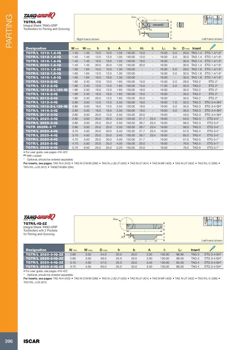 Dmax l2 l1 TGTR/L-IQ Integral Shank TANG-GRIP h h H2 Toolholders for Parting and Grooving W L3 h4 A b Right-hand shown Left-hand shown PARTING Designation W min W max h b A l 1 H 2 l 2 L 3 h 4 D max Insert TGTR/L 1010-1.4-IQ 1.40 1.45 10.0 10.0 1.05 140.00 15.0 - 15.50 5.0 20.0 TAG 1.4 ETG 1.4/1.6* TGTR/L 1212-1.4-IQ 1.40 1.45 12.0 12.0 1.05 140.00 12.0 - 16.00 3.0 30.0 TAG 1.4 ETG 1.4/1.6* TGTR/L 1616-1.4-IQ 1.40 1.45 16.0 16.0 1.05 140.00 16.0 - 16.00 - 30.0 TAG 1.4 ETG 1.4/1.6* TGTR/L 2020-1.4-IQ 1.40 1.45 20.0 20.0 1.05 140.00 20.0 - 16.00 - 30.0 TAG 1.4 ETG 1.4/1.6* TGTR/L 1010-1.6-IQ 1.60 1.64 10.0 10.0 1.30 120.00 - - 16.00 5.0 28.0 TAG 1.6 ETG 1.4/1.6* TGTR/L 1212-1.6-IQ 1.60 1.64 12.0 12.0 1.30 120.00 - - 16.00 3.0 32.0 TAG 1.6 ETG 1.4/1.6* TGTR/L 1616-1.6-IQ 1.60 1.64 16.0 16.0 1.30 120.00 - - 16.00 - 35.0 TAG 1.6 ETG 1.4/1.6* TGTR/L 1010-2-IQ 1.80 2.40 10.0 10.0 1.65 150.00 15.0 - 15.50 5.0 28.0 TAG 2 ETG 2* TGTR/L 1212-2-IQ 1.80 2.40 12.0 12.0 1.65 150.00 15.0 - 17.00 3.0 32.0 TAG 2 ETG 2* TGTR/L 1612-2-L120-IQ 1.80 2.50 16.0 12.0 1.65 120.00 16.0 - 16.00 - 35.0 TAG 2 ETG 2* TGTR/L 1616-2-IQ 1.80 2.40 16.0 16.0 1.65 150.00 16.0 - 16.00 - 35.0 TAG 2 ETG 2* TGTR/L 2012-2-IQ 1.80 2.40 20.0 12.0 1.65 125.00 20.0 - 16.00 - 35.0 TAG 2 ETG 2* TGTR/L 1212-3-IQ 2.80 3.50 12.0 12.0 2.50 150.00 19.0 - 19.00 7.0 32.0 TAG 3 ETG 3-4-SH* TGTR/L 1612-3-L120-IQ 2.80 3.50 16.0 12.0 2.50 120.00 19.0 - 19.00 3.0 35.0 TAG 3 ETG 3-4-SH* TGTR/L 1616-3-IQ 2.80 3.50 16.0 16.0 2.50 150.00 19.0 - 19.00 3.0 35.0 TAG 3 ETG 3-4-SH* TGTR/L 2012-3-IQ 2.80 3.50 20.0 12.0 2.50 125.00 20.0 - 19.00 - 43.0 TAG 3 ETG 3-4-SH* TGTR/L 2020-3-IQ 2.80 3.50 20.0 20.0 2.50 120.50 21.7 23.4 19.00 - 54.0 TAG 3 ETG 3-4* TGTR/L 2525-3-IQ 2.80 3.50 25.0 25.0 2.50 150.50 26.7 23.4 19.00 - 56.0 TAG 3 ETG 3-4* TGTR 2525K-3 (1) 2.80 3.50 25.0 25.0 2.50 150.00 26.7 23.4 19.00 - 56.0 TAG 3 ETG 3-4* TGTR/L 2020-4-IQ 3.70 4.50 20.0 20.0 3.40 120.50 21.7 23.4 19.00 - 57.0 TAG 4 ETG 3-4* TGTR/L 2525-4-IQ 3.70 4.50 25.0 25.0 3.40 150.50 26.7 23.4 19.00 - 65.0 TAG 4 ETG 3-4* TGTR/L 2020-5-IQ 4.70 5.50 20.0 20.0 4.00 120.00 21.7 - 19.00 - 57.0 TAG 5 ETG 5-7* TGTR/L 2525-5-IQ 4.70 5.50 25.0 25.0 4.00 150.00 25.0 - 19.00 - 76.0 TAG 5 ETG 5-7* TGTR/L 2525-6-IQ 5.70 6.50 25.0 25.0 5.20 150.00 25.0 - 19.00 - 76.0 TAG 6 ETG 5-7* • For user guide, see pages 416-422 (1) With coolant * Optional, should be ordered separately For inserts, see pages: TAG N-A (402) • TAG N-C/W/M (399) • TAG N-J/JS/JT (400) • TAG N-LF (401) • TAG N-MF (400) • TAG N-UT (402) • TAG R/L-C (399) • TAG R/L-J/JS (401) • TAGB/TAGBA (284) Dmax TGTR/L-IQ-2Z Integral Shank TANG-GRIP h Toolholders with 2 Pockets l1 for Parting and Grooving W A b L2 Left-hand shown Designation W min W max D max h b A l 1 L 2 Insert TGTR/L 2020-3-IQ-2Z 2.80 3.50 54.0 20.0 20.0 2.50 150.00 98.90 TAG 3 ETG 3-4-SH* TGTR/L 2525-3-IQ-2Z 2.80 3.50 56.0 25.0 25.0 2.50 150.00 98.00 TAG 3 ETG 3-4-SH* TGTR/L 2020-4-IQ-2Z 3.70 4.50 57.0 20.0 20.0 3.40 150.00 95.00 TAG 4 ETG 3-4-SH* TGTR/L 2525-4-IQ-2Z 3.70 4.50 65.0 25.0 25.0 3.40 150.00 88.00 TAG 4 ETG 3-4-SH* • For user guide, see pages 416-422 * Optional, should be ordered separately For inserts, see pages: TAG N-A (402) • TAG N-C/W/M (399) • TAG N-J/JS/JT (400) • TAG N-LF (401) • TAG N-MF (400) • TAG N-UT (402) • TAG R/L-C (399) • TAG R/L-J/JS (401) 396 ISCAR