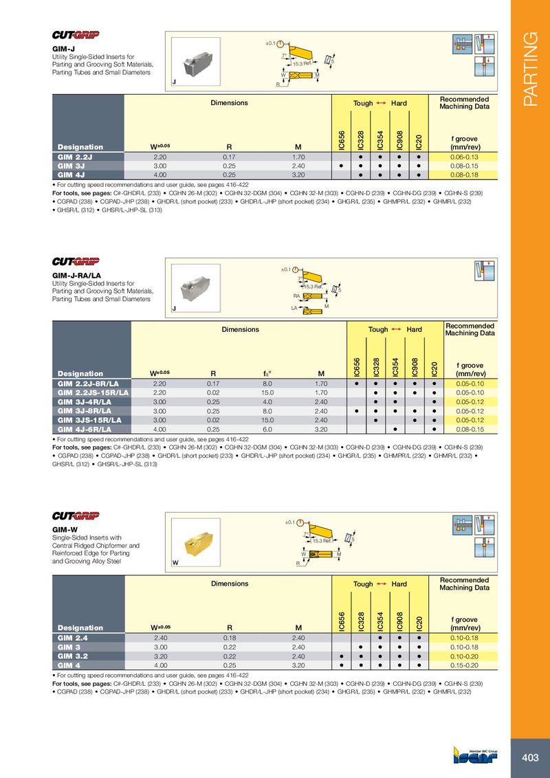 ±0.1 GIM-J Utility Single-Sided Inserts for 7° 5 Parting and Grooving Soft Materials, 15.3 Ref. Parting Tubes and Small Diameters W M R Recommended Dimensions Tough 1 Hard Machining Data PARTING f groove Designation W ±0.05 R M IC656 IC328 IC354 IC908 IC20 (mm/rev) GIM 2.2J 2.20 0.17 1.70 • • • • 0.06-0.13 GIM 3J 3.00 0.25 2.40 • • • • • 0.08-0.15 GIM 4J 4.00 0.25 3.20 • • • • 0.08-0.18 • For cutting speed recommendations and user guide, see pages 416-422 For tools, see pages: C#-GHDR/L (233) • CGHN 26-M (302) • CGHN 32-DGM (304) • CGHN 32-M (303) • CGHN-D (239) • CGHN-DG (239) • CGHN-S (239) • CGPAD (238) • CGPAD-JHP (238) • GHDR/L (short pocket) (233) • GHDR/L-JHP (short pocket) (234) • GHGR/L (235) • GHMPR/L (232) • GHMR/L (232) • GHSR/L (312) • GHSR/L-JHP-SL (313) ±0.1 GIM-J-RA/LA 7° Utility Single-Sided Inserts for 15.3 Ref. Parting and Grooving Soft Materials, 5 RA Parting Tubes and Small Diameters LA M Recommended Dimensions Tough 1 Hard Machining Data f groove Designation W ±0.05 R f a ° M IC656 IC328 IC354 IC908 IC20 (mm/rev) GIM 2.2J-8R/LA 2.20 0.17 8.0 1.70 • • • • • 0.05-0.10 GIM 2.2JS-15R/LA 2.20 0.02 15.0 1.70 • • • • 0.05-0.10 GIM 3J-4R/LA 3.00 0.25 4.0 2.40 • • • 0.05-0.12 GIM 3J-8R/LA 3.00 0.25 8.0 2.40 • • • • • 0.05-0.12 GIM 3JS-15R/LA 3.00 0.02 15.0 2.40 • • • 0.05-0.12 GIM 4J-6R/LA 4.00 0.25 6.0 3.20 • • 0.08-0.15 • For cutting speed recommendations and user guide, see pages 416-422 For tools, see pages: C#-GHDR/L (233) • CGHN 26-M (302) • CGHN 32-DGM (304) • CGHN 32-M (303) • CGHN-D (239) • CGHN-DG (239) • CGHN-S (239) • CGPAD (238) • CGPAD-JHP (238) • GHDR/L (short pocket) (233) • GHDR/L-JHP (short pocket) (234) • GHGR/L (235) • GHMPR/L (232) • GHMR/L (232) • GHSR/L (312) • GHSR/L-JHP-SL (313) ±0.1 GIM-W 7° Single-Sided Inserts with 15.3 Ref. 5 Central Ridged Chipformer and Reinforced Edge for Parting W M and Grooving Alloy Steel R Recommended Dimensions Tough 1 Hard Machining Data f groove Designation W ±0.05 R M IC656 IC328 IC354 IC908 IC20 (mm/rev) GIM 2.4 2.40 0.18 2.40 • • • 0.10-0.18 GIM 3 3.00 0.22 2.40 • • • • 0.10-0.18 GIM 3.2 3.20 0.22 2.40 • • • • • 0.10-0.20 GIM 4 4.00 0.25 3.20 • • • • • 0.15-0.20 • For cutting speed recommendations and user guide, see pages 416-422 For tools, see pages: C#-GHDR/L (233) • CGHN 26-M (302) • CGHN 32-DGM (304) • CGHN 32-M (303) • CGHN-D (239) • CGHN-DG (239) • CGHN-S (239) • CGPAD (238) • CGPAD-JHP (238) • GHDR/L (short pocket) (233) • GHDR/L-JHP (short pocket) (234) • GHGR/L (235) • GHMPR/L (232) • GHMR/L (232) 403