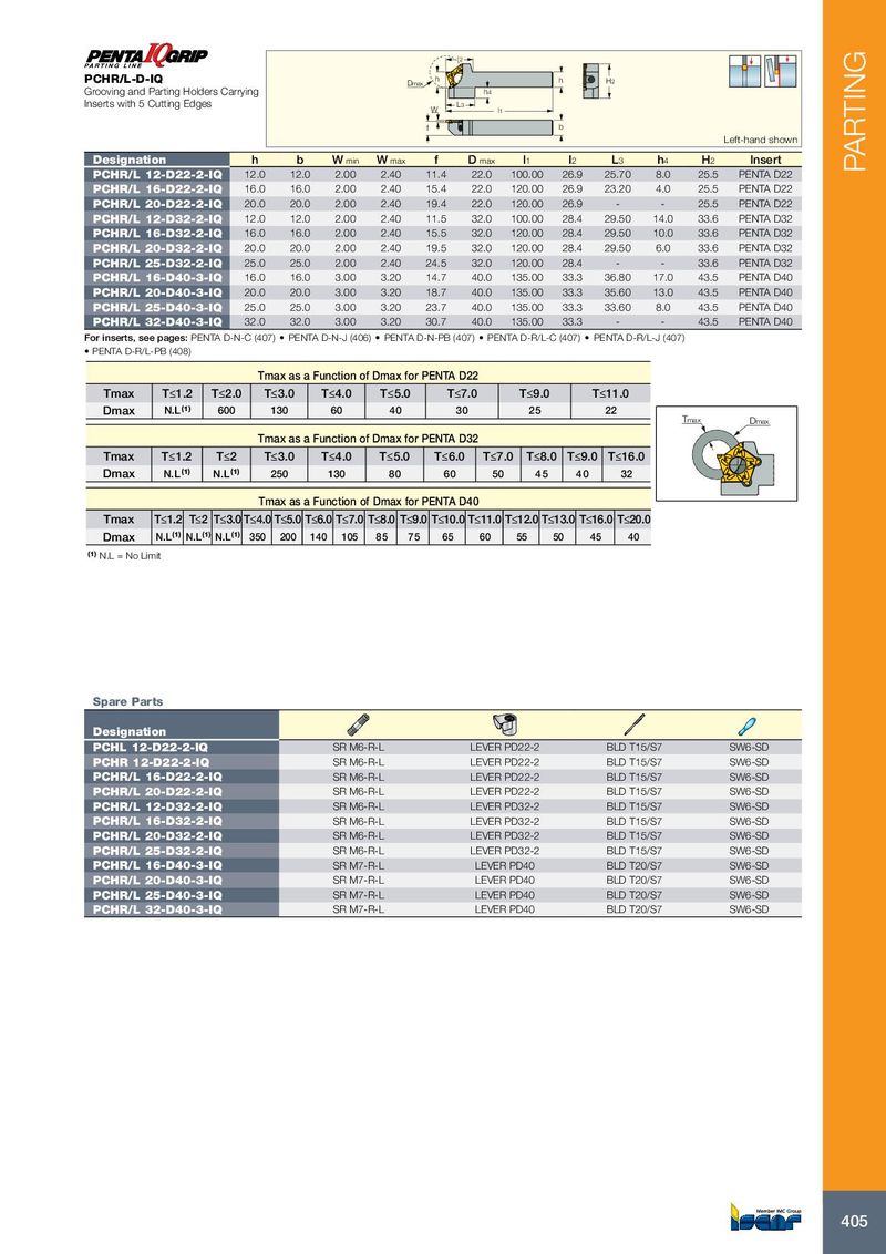 l2 PCHR/L-D-IQ D max h h H2 Grooving and Parting Holders Carrying h4 Inserts with 5 Cutting Edges L3 W l1 f b Left-hand shown Designation h b W min W max f D max l 1 l 2 L 3 h 4 H 2 Insert PARTING PCHR/L 12-D22-2-IQ 12.0 12.0 2.00 2.40 11.4 22.0 100.00 26.9 25.70 8.0 25.5 PENTA D22 PCHR/L 16-D22-2-IQ 16.0 16.0 2.00 2.40 15.4 22.0 120.00 26.9 23.20 4.0 25.5 PENTA D22 PCHR/L 20-D22-2-IQ 20.0 20.0 2.00 2.40 19.4 22.0 120.00 26.9 - - 25.5 PENTA D22 PCHR/L 12-D32-2-IQ 12.0 12.0 2.00 2.40 11.5 32.0 100.00 28.4 29.50 14.0 33.6 PENTA D32 PCHR/L 16-D32-2-IQ 16.0 16.0 2.00 2.40 15.5 32.0 120.00 28.4 29.50 10.0 33.6 PENTA D32 PCHR/L 20-D32-2-IQ 20.0 20.0 2.00 2.40 19.5 32.0 120.00 28.4 29.50 6.0 33.6 PENTA D32 PCHR/L 25-D32-2-IQ 25.0 25.0 2.00 2.40 24.5 32.0 120.00 28.4 - - 33.6 PENTA D32 PCHR/L 16-D40-3-IQ 16.0 16.0 3.00 3.20 14.7 40.0 135.00 33.3 36.80 17.0 43.5 PENTA D40 PCHR/L 20-D40-3-IQ 20.0 20.0 3.00 3.20 18.7 40.0 135.00 33.3 35.60 13.0 43.5 PENTA D40 PCHR/L 25-D40-3-IQ 25.0 25.0 3.00 3.20 23.7 40.0 135.00 33.3 33.60 8.0 43.5 PENTA D40 PCHR/L 32-D40-3-IQ 32.0 32.0 3.00 3.20 30.7 40.0 135.00 33.3 - - 43.5 PENTA D40 For inserts, see pages: PENTA D-N-C (407) • PENTA D-N-J (406) • PENTA D-N-PB (407) • PENTA D-R/L-C (407) • PENTA D-R/L-J (407) • PENTA D-R/L-PB (408) Tmax as a Function of Dmax for PENTA D22 Tmax T≤1.2 T≤2.0 T≤3.0 T≤4.0 T≤5.0 T≤7.0 T≤9.0 T≤11.0 Dmax N.L (1) 600 130 60 40 30 25 22 Tmax Dmax Tmax as a Function of Dmax for PENTA D32 Tmax T≤1.2 T≤2 T≤3.0 T≤4.0 T≤5.0 T≤6.0 T≤7.0 T≤8.0 T≤9.0 T≤16.0 Dmax N.L (1) N.L (1) 250 130 80 60 50 45 40 32 Tmax as a Function of Dmax for PENTA D40 Tmax T≤1.2 T≤2 T≤3.0 T≤4.0 T≤5.0 T≤6.0 T≤7.0 T≤8.0 T≤9.0 T≤10.0 T≤11.0 T≤12.0 T≤13.0 T≤16.0 T≤20.0 Dmax N.L (1) N.L (1) N.L (1) 350 200 140 105 85 75 65 60 55 50 45 40 (1) N.L = No Limit Spare Parts Designation PCHL 12-D22-2-IQ SR M6-R-L LEVER PD22-2 BLD T15/S7 SW6-SD PCHR 12-D22-2-IQ SR M6-R-L LEVER PD22-2 BLD T15/S7 SW6-SD PCHR/L 16-D22-2-IQ SR M6-R-L LEVER PD22-2 BLD T15/S7 SW6-SD PCHR/L 20-D22-2-IQ SR M6-R-L LEVER PD22-2 BLD T15/S7 SW6-SD PCHR/L 12-D32-2-IQ SR M6-R-L LEVER PD32-2 BLD T15/S7 SW6-SD PCHR/L 16-D32-2-IQ SR M6-R-L LEVER PD32-2 BLD T15/S7 SW6-SD PCHR/L 20-D32-2-IQ SR M6-R-L LEVER PD32-2 BLD T15/S7 SW6-SD PCHR/L 25-D32-2-IQ SR M6-R-L LEVER PD32-2 BLD T15/S7 SW6-SD PCHR/L 16-D40-3-IQ SR M7-R-L LEVER PD40 BLD T20/S7 SW6-SD PCHR/L 20-D40-3-IQ SR M7-R-L LEVER PD40 BLD T20/S7 SW6-SD PCHR/L 25-D40-3-IQ SR M7-R-L LEVER PD40 BLD T20/S7 SW6-SD PCHR/L 32-D40-3-IQ SR M7-R-L LEVER PD40 BLD T20/S7 SW6-SD 405