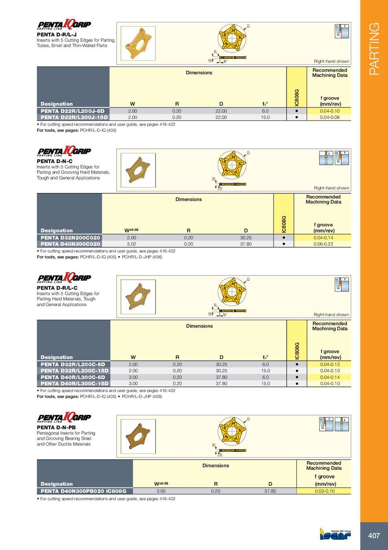 D PENTA D-R/L-J Inserts with 5 Cutting Edges for Parting Tubes, Small and Thin-Walled Parts R W fa° Right-hand shown Recommended Dimensions Machining Data PARTING f groove Designation W R D f a ° IC808G (mm/rev) PENTA D22R/L200J-6D 2.00 0.20 22.00 6.0 • 0.04-0.10 PENTA D22R/L200J-15D 2.00 0.20 22.00 15.0 • 0.04-0.08 • For cutting speed recommendations and user guide, see pages 416-422 For tools, see pages: PCHR/L-D-IQ (405) D PENTA D-N-C Inserts with 5 Cutting Edges for Parting and Grooving Hard Materials, Tough and General Applications W R Right-hand shown Recommended Dimensions Machining Data f groove Designation W ±0.02 R D IC808G (mm/rev) PENTA D32N200C020 2.00 0.20 30.25 • 0.04-0.14 PENTA D40N300C020 3.02 0.20 37.80 • 0.06-0.22 • For cutting speed recommendations and user guide, see pages 416-422 For tools, see pages: PCHR/L-D-IQ (405) • PCHR/L-D-JHP (406) D PENTA D-R/L-C Inserts with 5 Cutting Edges for Parting Hard Materials, Tough and General Applications R W fa° Right-hand shown Recommended Dimensions Machining Data f groove Designation W R D f a ° IC808G (mm/rev) PENTA D32R/L200C-6D 2.00 0.20 30.25 6.0 • 0.04-0.12 PENTA D32R/L200C-15D 2.00 0.20 30.25 15.0 • 0.04-0.10 PENTA D40R/L300C-6D 3.00 0.20 37.80 6.0 • 0.04-0.14 PENTA D40R/L300C-15D 3.00 0.20 37.80 15.0 • 0.04-0.10 • For cutting speed recommendations and user guide, see pages 416-422 For tools, see pages: PCHR/L-D-IQ (405) • PCHR/L-D-JHP (406) D PENTA D-N-PB Pentagonal Inserts for Parting and Grooving Bearing Steel and Other Ductile Materials W R Recommended Dimensions Machining Data f groove Designation W ±0.02 R D (mm/rev) PENTA D40N300PB020 IC808G 3.00 0.20 37.80 0.03-0.10 • For cutting speed recommendations and user guide, see pages 416-422 407