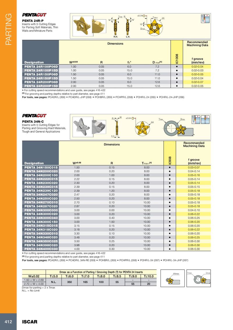 Tmax R ±0.04 Tmax-r 24 PENTA 24R-P fa˚ fa˚ Inserts with 5 Cutting Edges 12° for Parting Soft Materials, Thin Dmax Walls and Miniature Parts R.H. L.H. Recommended PARTING Dimensions Machining Data f groove Designation W ±0.02 R f a ° D max (1) IC1008 (mm/rev) PENTA 24R100P06D 1.00 0.05 6.0 7.2 • 0.02-0.04 PENTA 24R100P15D 1.00 0.05 15.0 7.2 • 0.02-0.03 PENTA 24R150P06D 1.50 0.05 6.0 11.0 • 0.02-0.05 PENTA 24R150P15D 1.50 0.05 15.0 11.0 • 0.02-0.04 PENTA 24R200P06D 2.00 0.05 6.0 12.6 • 0.02-0.07 PENTA 24R200P15D 2.00 0.05 15.0 12.6 • 0.02-0.05 • For cutting speed recommendations and user guide, see pages 416-422 (1) For grooving and parting depths relative to part diameter, see page 411 For tools, see pages: PCADR/L (268) • PCADR/L-JHP (268) • PCHBR/L (269) • PCHPR/L (268) • PCHR/L-24 (265) • PCHR/L-24-JHP (266) R W ±0.04 Tmax Dmax PENTA 34N-C 34 Inserts with 5 Cutting Edges for Parting and Grooving Hard Materials, Tough and General Applications 4.3 Recommended Dimensions Machining Data f groove Designation W ±0.02 R T max-r (1) IC908 (mm/rev) PENTA 34N150C015 1.50 0.15 8.00 • 0.03-0.07 PENTA 34N200C020 2.00 0.20 8.00 • 0.04-0.14 PENTA 34N200C100 2.00 1.00 8.00 • 0.05-0.16 PENTA 34N222C015 2.22 0.15 8.00 • 0.05-0.14 PENTA 34N230C020 2.30 0.20 8.00 • 0.05-0.14 PENTA 34N239C015 2.39 0.15 8.00 • 0.05-0.15 PENTA 34N239C120 2.39 1.20 8.00 • 0.05-0.18 PENTA 34N247C020 2.47 0.20 8.00 • 0.05-0.18 PENTA 34N250C020 2.50 0.20 8.00 • 0.05-0.18 PENTA 34N270C010 2.70 0.10 10.00 • 0.05-0.18 PENTA 34N287C020 2.87 0.20 10.00 • 0.05-0.18 PENTA 34N300C000 3.00 0.00 10.00 • 0.04-0.10 PENTA 34N300C020 3.00 0.20 10.00 • 0.06-0.22 PENTA 34N300C040 3.00 0.40 10.00 • 0.06-0.25 PENTA 34N300C150 3.00 1.50 10.00 • 0.06-0.20 PENTA 34N315C015 3.15 0.15 10.00 • 0.06-0.20 PENTA 34N318C020 3.18 0.20 10.00 • 0.06-0.22 PENTA 34N330C010 3.30 0.10 10.00 • 0.06-0.20 PENTA 34N348C020 3.48 0.20 10.00 • 0.06-0.25 PENTA 34N350C025 3.50 0.25 10.00 • 0.06-0.30 PENTA 34N398C020 3.98 0.20 10.00 • 0.06-0.30 PENTA 34N400C030 4.00 0.30 10.00 • 0.06-0.30 • For cutting speed recommendations and user guide, see pages 416-422 (1) For grooving and parting depths relative to part diameter, see page 411 For tools, see pages: PCADR/L (268) • PCADR/L 34N-RE (269) • PCHBR/L (269) • PCHPR/L (268) • PCHR/L-34 (267) • PCHR/L-34-JHP (267) Dmax as a Function of Parting / Grooving Depth (T) for PENTA 34 Inserts ØDmax Tmax ÿ Dmax W±0.02 T≤5.0 T≤6.0 T≤7.0 T≤8.0 T≤8.5 T≤9.0 T≤10.0 1.50 ≤ W ≤ 2.69 - - N.L. 350 165 100 55 2.70 ≤ W ≤ 4.00 55 20 Dmax for parting = 2 x Tmax N.L. = No Limit 412 ISCAR