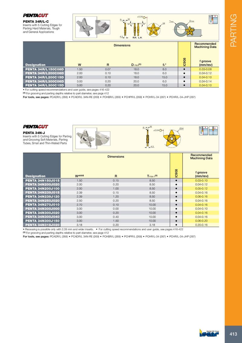 ±0.04 R W PENTA 34R/L-C Tmax Dmax faº faº 34 Inserts with 5 Cutting Edges for Parting Hard Materials, Tough and General Applications 4.3 R.H. L.H. Recommended Dimensions Machining Data PARTING f groove Designation W R D max (1) f a ° IC908 (mm/rev) PENTA 34R/L150C08D 1.50 0.07 18.0 8.0 • 0.03-0.08 PENTA 34R/L200C06D 2.00 0.10 18.0 6.0 • 0.04-0.12 PENTA 34R/L200C15D 2.00 0.10 18.0 15.0 • 0.04-0.10 PENTA 34R/L300C06D 3.00 0.20 20.0 6.0 • 0.04-0.14 PENTA 34R/L300C15D 3.00 0.20 20.0 15.0 • 0.04-0.10 • For cutting speed recommendations and user guide, see pages 416-422 (1) For grooving and parting depths relative to part diameter, see page 412 For tools, see pages: PCADR/L (268) • PCADR/L 34N-RE (269) • PCHBR/L (269) • PCHPR/L (268) • PCHR/L-34 (267) • PCHR/L-34-JHP (267) W R Ø34 ±0.04 PENTA 34N-J Inserts with 5 Cutting Edges for Parting and Grooving Soft Materials, Parting Tubes, Small and Thin-Walled Parts 4.3 Recommended Dimensions Machining Data f groove Designation W ±0.02 R T max-r (1) IC908 (mm/rev) PENTA 34N150J015 1.50 0.15 8.50 • 0.03-0.10 PENTA 34N200J020 2.00 0.20 8.50 • 0.04-0.12 PENTA 34N200J100 2.00 1.00 8.50 • 0.05-0.12 PENTA 34N239J015 2.39 0.15 8.50 • 0.04-0.16 PENTA 34N239J120 2.39 1.20 8.50 • 0.06-0.16 PENTA 34N250J020 2.50 0.20 8.50 • 0.04-0.16 PENTA 34N270J010 2.70 0.10 10.00 • 0.04-0.16 PENTA 34N300J000 3.00 0.00 10.00 • 0.04-0.10 PENTA 34N300J020 3.00 0.20 10.00 • 0.04-0.16 PENTA 34N300J040 3.00 0.40 10.00 • 0.04-0.16 PENTA 34N300J150 3.00 1.50 10.00 • 0.06-0.20 PENTA 34N318J020 3.18 0.20 3.18 • 0.20-0.16 • Recessing is possible only with 2.39 mm and wider inserts. • For cutting speed recommendations and user guide, see pages 416-422 (1) For grooving and parting depths relative to part diameter, see page 412 For tools, see pages: PCADR/L (268) • PCADR/L 34N-RE (269) • PCHBR/L (269) • PCHPR/L (268) • PCHR/L-34 (267) • PCHR/L-34-JHP (267) 413