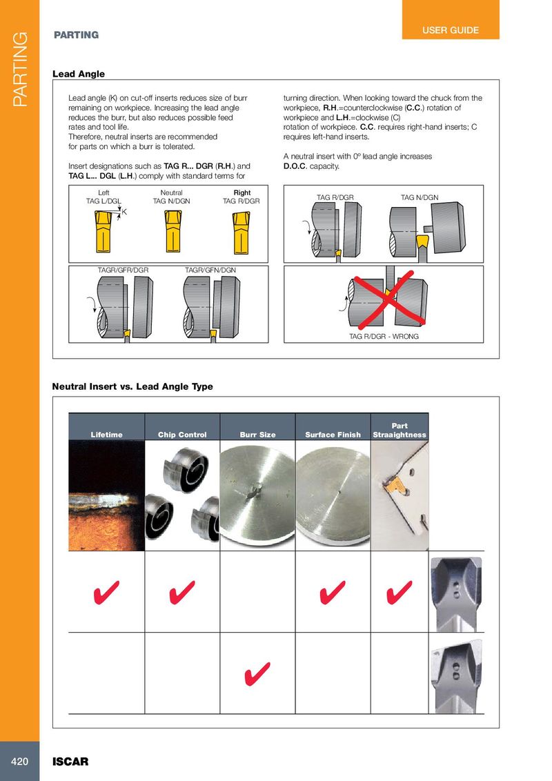 USER GUIDE PARTING Lead Angle Lead angle (K) on cut-off inserts reduces size of burr turning direction. When looking toward the chuck from the PARTING remaining on workpiece. Increasing the lead angle workpiece, R.H.=counterclockwise (C.C.) rotation of reduces the burr, but also reduces possible feed workpiece and L.H.=clockwise (C) rates and tool life. rotation of workpiece. C.C. requires right-hand inserts; C Therefore, neutral inserts are recommended requires left-hand inserts. for parts on which a burr is tolerated. A neutral insert with 0º lead angle increases Insert designations such as TAG R... DGR (R.H.) and D.O.C. capacity. TAG L... DGL (L.H.) comply with standard terms for Left Neutral Right TAG R/DGR TAG N/DGN TAG L/DGL TAG N/DGN TAG R/DGR K TAGR/GFR/DGR TAGR/GFN/DGN TAG R/DGR - WRONG Neutral Insert vs. Lead Angle Type Part Lifetime Chip Control Burr Size Surface Finish Straaightness ✔ ✔ ✔ ✔ ✔ 420 420 ISCAR ISCAR