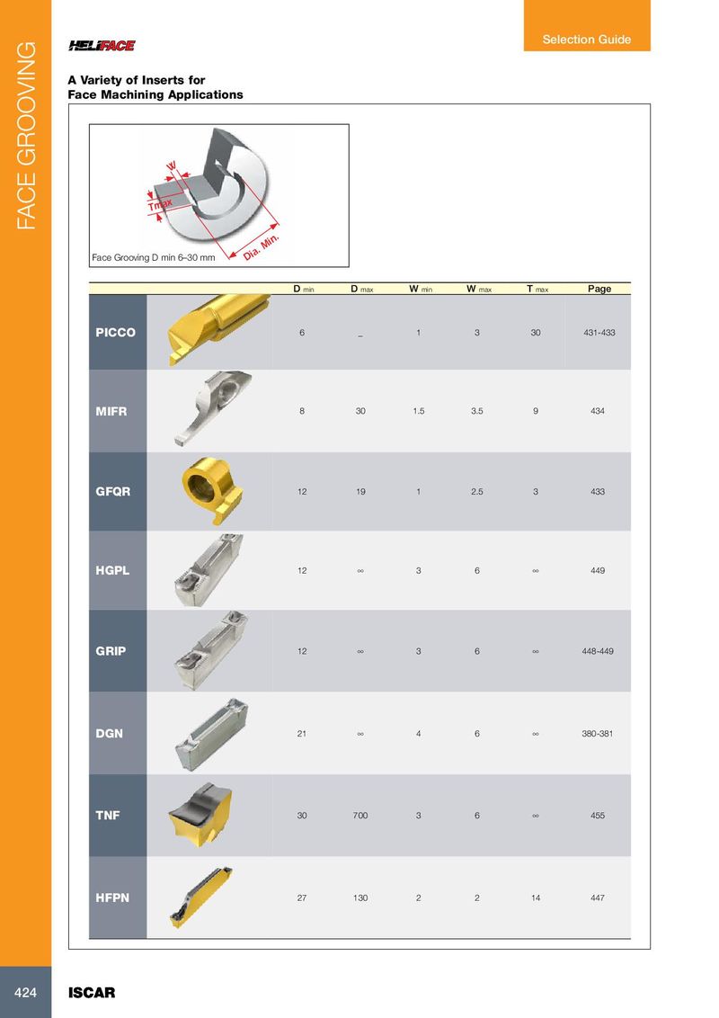 Selection Guide A Variety of Inserts for Face Machining Applications W Tmax FACE GROOVING Face Grooving D min 6–30 mm Dia. Min. D min D max W min W max T max Page PICCO 6 _ 1 3 30 431-433 MIFR 8 30 1.5 3.5 9 434 GFQR 12 19 1 2.5 3 433 HGPL 12 ∞ 3 6 ∞ 449 GRIP 12 ∞ 3 6 ∞ 448-449 DGN 21 ∞ 4 6 ∞ 380-381 TNF 30 700 3 6 ∞ 455 HFPN 27 130 2 2 14 447 424 424 ISCAR ISCAR