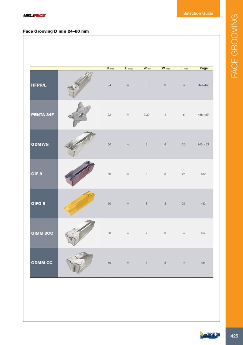 Selection Guide Face Grooving D min 24–80 mm D min D max W min W max T max Page FACE GROOVING HFPR/L 24 ∞ 3 6 ∞ 447-448 PENTA 34F 22 ∞ 2.39 4 5 458-459 GDMY/N 50 ∞ 8 8 25 246, 453 GIF 8 80 ∞ 8 8 25 452 GIFG 8 50 ∞ 8 8 25 452 GIMM 8CC 80 ∞ 7 8 ∞ 454 GDMM CC 50 ∞ 8 8 ∞ 454 425 425