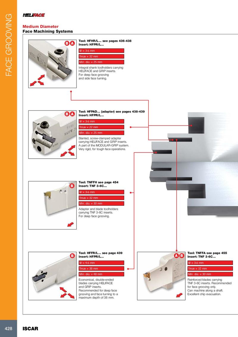 Medium Diameter Face Machining Systems Tool: HFHR/L… see pages 436-438 B A Insert: HFPR/L… W = 3-6 mm Tmax = 32 mm Min. dia. = 25 mm Integral shank toolholders carrying HELIFACE and GRIP inserts. FACE GROOVING For deep face grooving and side face turning. Tool: HFPAD… (adapter) see pages 438-439 B A Insert: HFPR/L… W = 3-6 mm Tmax = 22 mm Min. dia. = 25 mm Slanted, screw-clamped adapter carrying HELIFACE and GRIP inserts. A part of the MODULAR-GRIP system. Very rigid, for tough face operations. Tool: TNFFH see page 454 B Insert: TNF 3-6C… W = 3-6 mm Tmax = 32 mm Min. dia. = 30 mm Adapter and blade toolholders carrying TNF 3-6C inserts. For deep face grooving. Tool: HFFR/L… see page 439 Tool: TNFFA see page 455 B Insert: HFPR/L… A B Insert: TNF 3-6C… W = 4-6 mm W = 3-6 mm Tmax = 38 mm Tmax = 32 mm Min. dia. = 48 mm Min. dia. = 30 mm Economical, double-ended Reinforced blades carrying blades carrying HELIFACE TNF 3-6C inserts. Recommended and GRIP inserts. for face grooving only. Recommended for deep face Can machine along a shaft. grooving and face turning to a Excellent chip evacuation. maximum depth of 38 mm. 428 428 ISCAR ISCAR