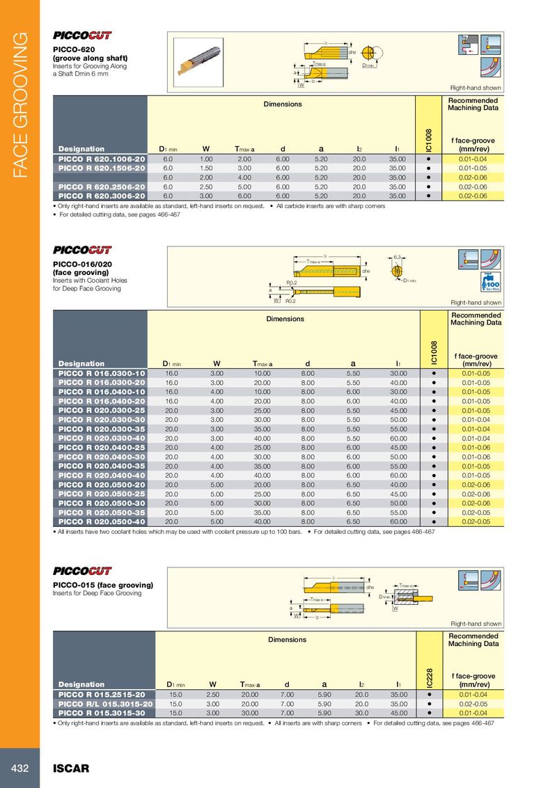 l1 PICCO-620 dh6 (groove along shaft) Tmax-a Inserts for Grooving Along D1min. a Shaft Dmin 6 mm a l2 W Right-hand shown Recommended Dimensions Machining Data f face-groove Designation D 1 min W T max- a d a l 2 l 1 IC1008 (mm/rev) PICCO R 620.1006-20 6.0 1.00 2.00 6.00 5.20 20.0 35.00 • 0.01-0.04 PICCO R 620.1506-20 6.0 1.50 3.00 6.00 5.20 20.0 35.00 • 0.01-0.05 FACE GROOVING 6.0 2.00 4.00 6.00 5.20 20.0 35.00 • 0.02-0.06 PICCO R 620.2506-20 6.0 2.50 5.00 6.00 5.20 20.0 35.00 • 0.02-0.06 PICCO R 620.3006-20 6.0 3.00 6.00 6.00 5.20 20.0 35.00 • 0.02-0.06 • Only right-hand inserts are available as standard, left-hand inserts on request. • All carbide inserts are with sharp corners • For detailed cutting data, see pages 466-467 l1 6.3 Tmax-a PICCO-016/020 (face grooving) dh6 Inserts with Coolant Holes R0.2 D1 min. for Deep Face Grooving a Bar Max W R0.2 Right-hand shown Recommended Dimensions Machining Data f face-groove Designation D 1 min W T max- a d a l 1 IC1008 (mm/rev) PICCO R 016.0300-10 16.0 3.00 10.00 8.00 5.50 30.00 • 0.01-0.05 PICCO R 016.0300-20 16.0 3.00 20.00 8.00 5.50 40.00 • 0.01-0.05 PICCO R 016.0400-10 16.0 4.00 10.00 8.00 6.00 30.00 • 0.01-0.05 PICCO R 016.0400-20 16.0 4.00 20.00 8.00 6.00 40.00 • 0.01-0.05 PICCO R 020.0300-25 20.0 3.00 25.00 8.00 5.50 45.00 • 0.01-0.05 PICCO R 020.0300-30 20.0 3.00 30.00 8.00 5.50 50.00 • 0.01-0.04 PICCO R 020.0300-35 20.0 3.00 35.00 8.00 5.50 55.00 • 0.01-0.04 PICCO R 020.0300-40 20.0 3.00 40.00 8.00 5.50 60.00 • 0.01-0.04 PICCO R 020.0400-25 20.0 4.00 25.00 8.00 6.00 45.00 • 0.01-0.06 PICCO R 020.0400-30 20.0 4.00 30.00 8.00 6.00 50.00 • 0.01-0.06 PICCO R 020.0400-35 20.0 4.00 35.00 8.00 6.00 55.00 • 0.01-0.05 PICCO R 020.0400-40 20.0 4.00 40.00 8.00 6.00 60.00 • 0.01-0.05 PICCO R 020.0500-20 20.0 5.00 20.00 8.00 6.50 40.00 • 0.02-0.06 PICCO R 020.0500-25 20.0 5.00 25.00 8.00 6.50 45.00 • 0.02-0.06 PICCO R 020.0500-30 20.0 5.00 30.00 8.00 6.50 50.00 • 0.02-0.06 PICCO R 020.0500-35 20.0 5.00 35.00 8.00 6.50 55.00 • 0.02-0.05 PICCO R 020.0500-40 20.0 5.00 40.00 8.00 6.50 60.00 • 0.02-0.05 • All inserts have two coolant holes which may be used with coolant pressure up to 100 bars. • For detailed cutting data, see pages 466-467 l1 PICCO-015 (face grooving) dh6 Tmax-a Inserts for Deep Face Grooving D1min. Tmax-a a W W l2 Right-hand shown Recommended Dimensions Machining Data f face-groove Designation D 1 min W T max- a d a l 2 l 1 IC228 (mm/rev) PICCO R 015.2515-20 15.0 2.50 20.00 7.00 5.90 20.0 35.00 • 0.01-0.04 PICCO R/L 015.3015-20 15.0 3.00 20.00 7.00 5.90 20.0 35.00 • 0.02-0.05 PICCO R 015.3015-30 15.0 3.00 30.00 7.00 5.90 30.0 45.00 • 0.01-0.04 • Only right-hand inserts are available as standard, left-hand inserts on request. • All inserts are with sharp corners • For detailed cutting data, see pages 466-467 432 ISCAR