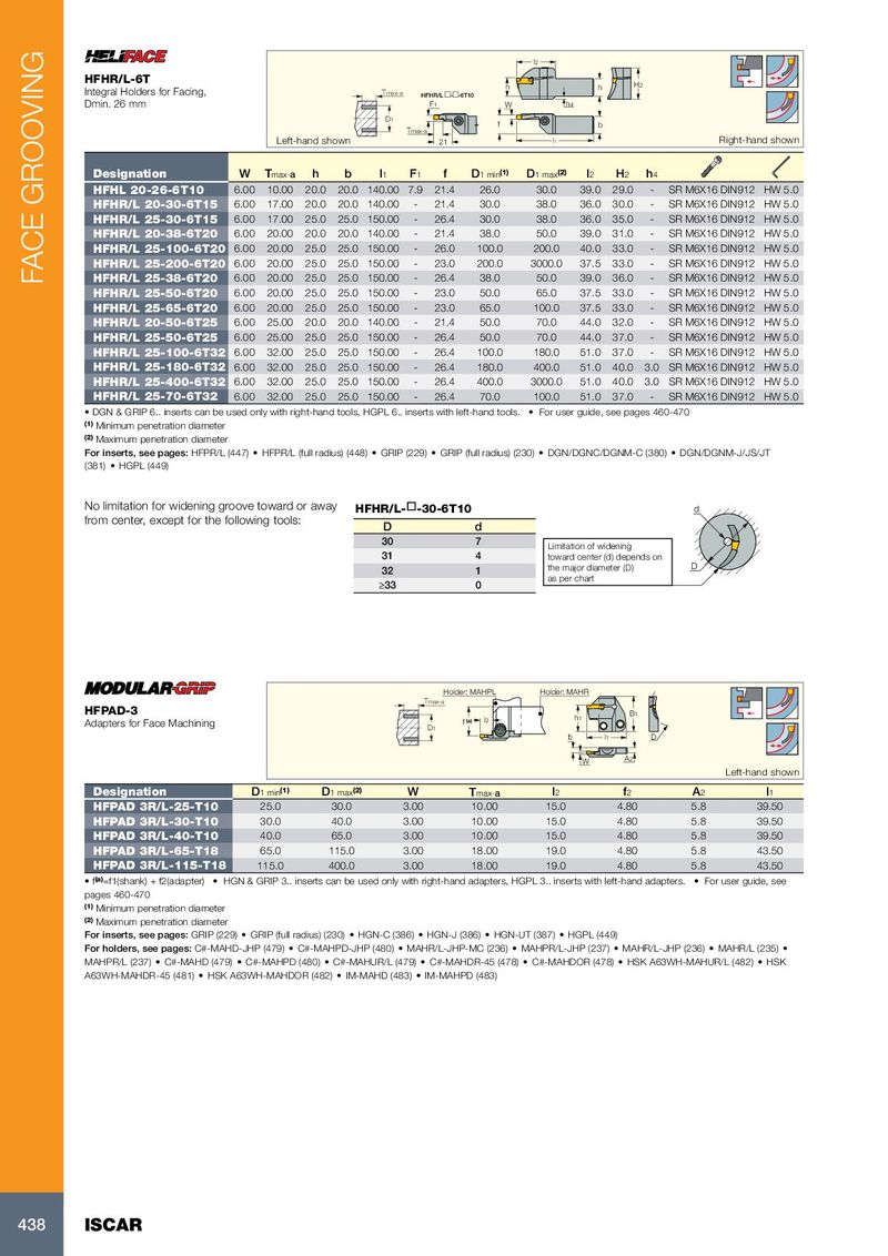 l2 HFHR/L-6T h h H2 Integral Holders for Facing, Tmax-a HFHR/L :-:-6T10 Dmin. 26 mm F1 W h4 D 1 f b Tmax-a Left-hand shown 21 l1 Right-hand shown Designation W T max- a h b l 1 F 1 f D 1 min (1) D 1 max (2) l 2 H 2 h 4 HFHL 20-26-6T10 6.00 10.00 20.0 20.0 140.00 7.9 21.4 26.0 30.0 39.0 29.0 - SR M6X16 DIN912 HW 5.0 HFHR/L 20-30-6T15 6.00 17.00 20.0 20.0 140.00 - 21.4 30.0 38.0 36.0 30.0 - SR M6X16 DIN912 HW 5.0 HFHR/L 25-30-6T15 6.00 17.00 25.0 25.0 150.00 - 26.4 30.0 38.0 36.0 35.0 - SR M6X16 DIN912 HW 5.0 HFHR/L 20-38-6T20 6.00 20.00 20.0 20.0 140.00 - 21.4 38.0 50.0 39.0 31.0 - SR M6X16 DIN912 HW 5.0 HFHR/L 25-100-6T20 6.00 20.00 25.0 25.0 150.00 - 26.0 100.0 200.0 40.0 33.0 - SR M6X16 DIN912 HW 5.0 HFHR/L 25-200-6T20 6.00 20.00 25.0 25.0 150.00 - 23.0 200.0 3000.0 37.5 33.0 - SR M6X16 DIN912 HW 5.0 FACE GROOVING HFHR/L 25-38-6T20 6.00 20.00 25.0 25.0 150.00 - 26.4 38.0 50.0 39.0 36.0 - SR M6X16 DIN912 HW 5.0 HFHR/L 25-50-6T20 6.00 20.00 25.0 25.0 150.00 - 23.0 50.0 65.0 37.5 33.0 - SR M6X16 DIN912 HW 5.0 HFHR/L 25-65-6T20 6.00 20.00 25.0 25.0 150.00 - 23.0 65.0 100.0 37.5 33.0 - SR M6X16 DIN912 HW 5.0 HFHR/L 20-50-6T25 6.00 25.00 20.0 20.0 140.00 - 21.4 50.0 70.0 44.0 32.0 - SR M6X16 DIN912 HW 5.0 HFHR/L 25-50-6T25 6.00 25.00 25.0 25.0 150.00 - 26.4 50.0 70.0 44.0 37.0 - SR M6X16 DIN912 HW 5.0 HFHR/L 25-100-6T32 6.00 32.00 25.0 25.0 150.00 - 26.4 100.0 180.0 51.0 37.0 - SR M6X16 DIN912 HW 5.0 HFHR/L 25-180-6T32 6.00 32.00 25.0 25.0 150.00 - 26.4 180.0 400.0 51.0 40.0 3.0 SR M6X16 DIN912 HW 5.0 HFHR/L 25-400-6T32 6.00 32.00 25.0 25.0 150.00 - 26.4 400.0 3000.0 51.0 40.0 3.0 SR M6X16 DIN912 HW 5.0 HFHR/L 25-70-6T32 6.00 32.00 25.0 25.0 150.00 - 26.4 70.0 100.0 51.0 37.0 - SR M6X16 DIN912 HW 5.0 • DGN & GRIP 6.. inserts can be used only with right-hand tools, HGPL 6.. inserts with left-hand tools. • For user guide, see pages 460-470 (1) Minimum penetration diameter (2) Maximum penetration diameter For inserts, see pages: HFPR/L (447) • HFPR/L (full radius) (448) • GRIP (229) • GRIP (full radius) (230) • DGN/DGNC/DGNM-C (380) • DGN/DGNM-J/JS/JT (381) • HGPL (449) No limitation for widening groove toward or away HFHR/L- ¨ -30-6T10 d from center, except for the following tools: D d 30 7 Limitation of widening 31 4 toward center (d) depends on 32 1 the major diameter (D) D as per chart ≥33 0 Holder: MAHPL Holder: MAHR Tmax-a HFPAD-3 B1 Adapters for Face Machining f (a) l2 h1 D 1 f2 l1 D W A2 Left-hand shown Designation D 1 min (1) D 1 max (2) W T max- a l 2 f 2 A 2 l 1 HFPAD 3R/L-25-T10 25.0 30.0 3.00 10.00 15.0 4.80 5.8 39.50 HFPAD 3R/L-30-T10 30.0 40.0 3.00 10.00 15.0 4.80 5.8 39.50 HFPAD 3R/L-40-T10 40.0 65.0 3.00 10.00 15.0 4.80 5.8 39.50 HFPAD 3R/L-65-T18 65.0 115.0 3.00 18.00 19.0 4.80 5.8 43.50 HFPAD 3R/L-115-T18 115.0 400.0 3.00 18.00 19.0 4.80 5.8 43.50 • f (a) =f1(shank) + f2(adapter) • HGN & GRIP 3.. inserts can be used only with right-hand adapters, HGPL 3.. inserts with left-hand adapters. • For user guide, see pages 460-470 (1) Minimum penetration diameter (2) Maximum penetration diameter For inserts, see pages: GRIP (229) • GRIP (full radius) (230) • HGN-C (386) • HGN-J (386) • HGN-UT (387) • HGPL (449) For holders, see pages: C#-MAHD-JHP (479) • C#-MAHPD-JHP (480) • MAHR/L-JHP-MC (236) • MAHPR/L-JHP (237) • MAHR/L-JHP (236) • MAHR/L (235) • MAHPR/L (237) • C#-MAHD (479) • C#-MAHPD (480) • C#-MAHUR/L (479) • C#-MAHDR-45 (478) • C#-MAHDOR (478) • HSK A63WH-MAHUR/L (482) • HSK A63WH-MAHDR-45 (481) • HSK A63WH-MAHDOR (482) • IM-MAHD (483) • IM-MAHPD (483) 438 ISCAR