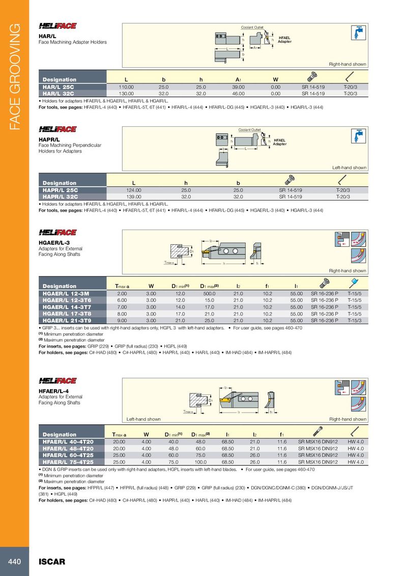 Coolant Outlet HAR/L h h HFAEL Face Machining Adapter Holders Adapter L A1 b Right-hand shown Designation L b h A 1 W HAR/L 25C 110.00 25.0 25.0 39.00 0.00 SR 14-519 T-20/3 HAR/L 32C 130.00 32.0 32.0 46.00 0.00 SR 14-519 T-20/3 • Holders for adapters HFAER/L & HGAER/L, HFAIR/L & HGAIR/L. For tools, see pages: HFAER/L-4 (440) • HFAER/L-5T, 6T (441) • HFAIR/L-4 (444) • HFAIR/L-DG (445) • HGAER/L-3 (440) • HGAIR/L-3 (444) FACE GROOVING Coolant Outlet HAPR/L h h HFAEL Face Machining Perpendicular Adapter b L Holders for Adapters Left-hand shown Designation L h b HAPR/L 25C 124.00 25.0 25.0 SR 14-519 T-20/3 HAPR/L 32C 139.00 32.0 32.0 SR 14-519 T-20/3 • Holders for adapters HFAER/L & HGAER/L, HFAIR/L & HGAIR/L. For tools, see pages: HFAER/L-4 (440) • HFAER/L-5T, 6T (441) • HFAIR/L-4 (444) • HFAIR/L-DG (445) • HGAER/L-3 (440) • HGAIR/L-3 (444) l2 HGAER/L-3 Adapters for External D 1 Facing Along Shafts Tmax-a l1 f1 Right-hand shown Designation T max- a W D 1 min (1) D 1 max (2) l 2 f 1 l 1 HGAER/L 12-3M 2.00 3.00 12.0 500.0 21.0 10.2 55.00 SR 16-236 P T-15/5 HGAER/L 12-3T6 6.00 3.00 12.0 15.0 21.0 10.2 55.00 SR 16-236 P T-15/5 HGAER/L 14-3T7 7.00 3.00 14.0 17.0 21.0 10.2 55.00 SR 16-236 P T-15/5 HGAER/L 17-3T8 8.00 3.00 17.0 21.0 21.0 10.2 55.00 SR 16-236 P T-15/5 HGAER/L 21-3T9 9.00 3.00 21.0 25.0 21.0 10.2 55.00 SR 16-236 P T-15/3 • GRIP 3... inserts can be used with right-hand adapters only, HGPL 3 with left-hand adapters. • For user guide, see pages 460-470 (1) Minimum penetration diameter (2) Maximum penetration diameter For inserts, see pages: GRIP (229) • GRIP (full radius) (230) • HGPL (449) For holders, see pages: C#-HAD (480) • C#-HAPR/L (480) • HAPR/L (440) • HAR/L (440) • IM-HAD (484) • IM-HAPR/L (484) l2 HFAER/L-4 Adapters for External D 1 Facing Along Shafts Tmax-a l1 f1 Left-hand shown Right-hand shown Designation T max- a W D 1 min (1) D 1 max (2) l 1 l 2 f 1 HFAER/L 40-4T20 20.00 4.00 40.0 48.0 68.50 21.0 11.6 SR M5X16 DIN912 HW 4.0 HFAER/L 48-4T20 20.00 4.00 48.0 60.0 68.50 21.0 11.6 SR M5X16 DIN912 HW 4.0 HFAER/L 60-4T25 25.00 4.00 60.0 75.0 68.50 26.0 11.6 SR M5X16 DIN912 HW 4.0 HFAER/L 75-4T25 25.00 4.00 75.0 100.0 68.50 26.0 11.6 SR M5X16 DIN912 HW 4.0 • DGN & GRIP inserts can be used only with right-hand adapters, HGPL inserts with left-hand blades. • For user guide, see pages 460-470 (1) Minimum penetration diameter (2) Maximum penetration diameter For inserts, see pages: HFPR/L (447) • HFPR/L (full radius) (448) • GRIP (229) • GRIP (full radius) (230) • DGN/DGNC/DGNM-C (380) • DGN/DGNM-J/JS/JT (381) • HGPL (449) For holders, see pages: C#-HAD (480) • C#-HAPR/L (480) • HAPR/L (440) • HAR/L (440) • IM-HAD (484) • IM-HAPR/L (484) 440 ISCAR