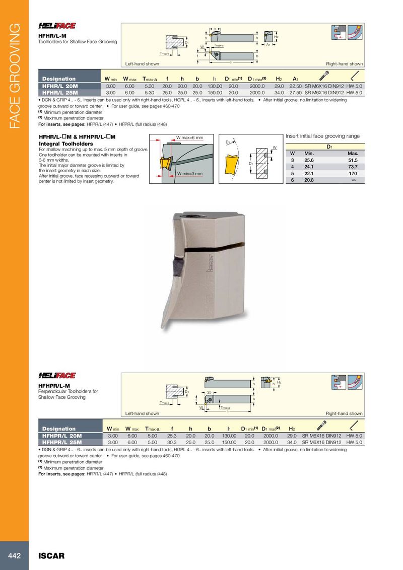 l2 HFHR/L-M h h H2 Toolholders for Shallow Face Grooving D 1 Tmax-a A1 W Tmax-a f b Left-hand shown l1 Right-hand shown Designation W min W max T max- a f h b l 1 D 1 min (1) D 1 max (2) H 2 A 1 HFHR/L 20M 3.00 6.00 5.30 20.0 20.0 20.0 130.00 20.0 2000.0 29.0 22.50 SR M6X16 DIN912 HW 5.0 HFHR/L 25M 3.00 6.00 5.30 25.0 25.0 25.0 150.00 20.0 2000.0 34.0 27.50 SR M6X16 DIN912 HW 5.0 • DGN & GRIP 4.. - 6.. inserts can be used only with right-hand tools, HGPL 4.. - 6.. inserts with left-hand tools. • After initial groove, no limitation to widening groove outward or toward center. • For user guide, see pages 460-470 (1) Minimum penetration diameter (2) Maximum penetration diameter For inserts, see pages: HFPR/L (447) • HFPR/L (full radius) (448) FACE GROOVING HFHR/L- ¨ M & HFHPR/L- ¨ M W max=6 mm Insert initial face grooving range D1 Integral Toolholders W D 1 For shallow machining up to max. 5 mm depth of groove. One toolholder can be mounted with inserts in W Min. Max. 3-6 mm widths. 3 25.6 51.5 The initial major diameter groove is limited by D1 4 24.1 73.7 the insert geometry in each size. W min=3 mm 5 22.1 170 After initial groove, face recessing outward or toward 6 20.8 ∞ center is not limited by insert geometry. h h H2 HFHPR/L-M Perpendicular Toolholders for D 1 25 Shallow Face Grooving f b Tmax-a W Tmax-a l1 Left-hand shown Right-hand shown Designation W min W max T max- a f h b l 1 D 1 min (1) D 1 max (2) H 2 HFHPR/L 20M 3.00 6.00 5.00 25.3 20.0 20.0 130.00 20.0 2000.0 29.0 SR M6X16 DIN912 HW 5.0 HFHPR/L 25M 3.00 6.00 5.00 30.3 25.0 25.0 150.00 20.0 2000.0 34.0 SR M6X16 DIN912 HW 5.0 • DGN & GRIP 4.. - 6.. inserts can be used only with right-hand tools, HGPL 4.. - 6.. inserts with left-hand tools. • After initial groove, no limitation to widening groove outward or toward center. • For user guide, see pages 460-470 (1) Minimum penetration diameter (2) Maximum penetration diameter For inserts, see pages: HFPR/L (447) • HFPR/L (full radius) (448) 442 ISCAR