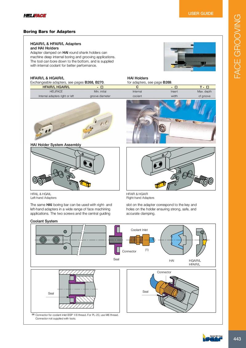 USER GUIDE Boring Bars for Adapters HGAIR/L & HFAIR/L Adapters and HAI Holders Adapter clamped on HAI round shank holders can machine deep internal boring and grooving applications. The tool can bore down to the bottom, and is supplied with internal coolant for better performance. HFAIR/L & HGAIR/L HAI Holders FACE GROOVING Exchangeable adapters, see pages B268, B270. for adapters, see page B269. HFAIR/L HGAIR/L - ¨ C - ¨ T - ¨ HELIFACE Min. initial Internal Insert Max. depth Internal adapters right or left groove diameter coolant width of groove HAI Holder System Assembly HFAIL & HGAIL HFAIR & HGAIR Left-hand Adapters Right-hand Adapters The same HAI boring bar can be used with right- and slot on the adapter correspond to the key and left-hand adapters in a wide range of face machining holes on the holder ensuring strong, safe, and applications. The two screws and the central guiding accurate clamping. Coolant System Coolant Inlet (1) Connector Seal HAI HGAIR/L HFAIR/L Connector Seal Seal (1) Connector for coolant inlet BSP 1/8 thread. For PL-20, use M6 thread. Connector not supplied with tools. 443 443