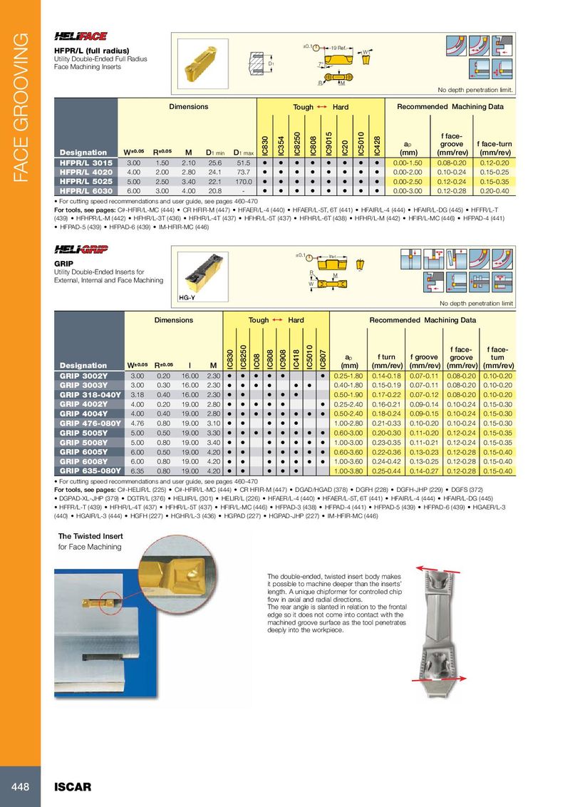 ±0.1 19 Ref. HFPR/L (full radius) W Utility Double-Ended Full Radius D 1 7° Face Machining Inserts R M No depth penetration limit. Dimensions Tough 1 Hard Recommended Machining Data f face- a p groove f face-turn Designation W ±0.05 R ±0.05 M D 1 min D 1 max IC830 IC354 IC8250 IC808 IC9015 IC20 IC5010 IC428 (mm) (mm/rev) (mm/rev) HFPR/L 3015 3.00 1.50 2.10 25.6 51.5 • • • • • • • • 0.00-1.50 0.08-0.20 0.12-0.20 HFPR/L 4020 4.00 2.00 2.80 24.1 73.7 • • • • • • • • 0.00-2.00 0.10-0.24 0.15-0.25 FACE GROOVING HFPR/L 5025 5.00 2.50 3.40 22.1 170.0 • • • • • • • • 0.00-2.50 0.12-0.24 0.15-0.35 HFPR/L 6030 6.00 3.00 4.00 20.8 - • • • • • • • • 0.00-3.00 0.12-0.28 0.20-0.40 • For cutting speed recommendations and user guide, see pages 460-470 For tools, see pages: C#-HFIR/L-MC (444) • CR HFIR-M (447) • HFAER/L-4 (440) • HFAER/L-5T, 6T (441) • HFAIR/L-4 (444) • HFAIR/L-DG (445) • HFFR/L-T (439) • HFHPR/L-M (442) • HFHR/L-3T (436) • HFHR/L-4T (437) • HFHR/L-5T (437) • HFHR/L-6T (438) • HFHR/L-M (442) • HFIR/L-MC (446) • HFPAD-4 (441) • HFPAD-5 (439) • HFPAD-6 (439) • IM-HFIR-MC (446) ±0.1 lRef. GRIP Utility Double-Ended Inserts for R M External, Internal and Face Machining W No depth penetration limit Dimensions Tough 1 Hard Recommended Machining Data f face- f face- a p f turn f groove groove turn Designation W ±0.05 R ±0.05 l M IC830 IC8250 IC08 IC808 IC908 IC418 IC5010 IC807 (mm) (mm/rev) (mm/rev) (mm/rev) (mm/rev) GRIP 3002Y 3.00 0.20 16.00 2.30 • • • • • • 0.25-1.80 0.14-0.18 0.07-0.11 0.08-0.20 0.10-0.20 GRIP 3003Y 3.00 0.30 16.00 2.30 • • • • • • 0.40-1.80 0.15-0.19 0.07-0.11 0.08-0.20 0.10-0.20 GRIP 318-040Y 3.18 0.40 16.00 2.30 • • • • • 0.50-1.90 0.17-0.22 0.07-0.12 0.08-0.20 0.10-0.20 GRIP 4002Y 4.00 0.20 19.00 2.80 • • • • • • 0.25-2.40 0.16-0.21 0.09-0.14 0.10-0.24 0.15-0.30 GRIP 4004Y 4.00 0.40 19.00 2.80 • • • • • • • • 0.50-2.40 0.18-0.24 0.09-0.15 0.10-0.24 0.15-0.30 GRIP 476-080Y 4.76 0.80 19.00 3.10 • • • • • 1.00-2.80 0.21-0.33 0.10-0.20 0.10-0.24 0.15-0.30 GRIP 5005Y 5.00 0.50 19.00 3.30 • • • • • • • • 0.60-3.00 0.20-0.30 0.11-0.20 0.12-0.24 0.15-0.35 GRIP 5008Y 5.00 0.80 19.00 3.40 • • • • • • • 1.00-3.00 0.23-0.35 0.11-0.21 0.12-0.24 0.15-0.35 GRIP 6005Y 6.00 0.50 19.00 4.20 • • • • • • • 0.60-3.60 0.22-0.36 0.13-0.23 0.12-0.28 0.15-0.40 GRIP 6008Y 6.00 0.80 19.00 4.20 • • • • • • • 1.00-3.60 0.24-0.42 0.13-0.25 0.12-0.28 0.15-0.40 GRIP 635-080Y 6.35 0.80 19.00 4.20 • • • • • 1.00-3.80 0.25-0.44 0.14-0.27 0.12-0.28 0.15-0.40 • For cutting speed recommendations and user guide, see pages 460-470 For tools, see pages: C#-HELIR/L (225) • C#-HFIR/L-MC (444) • CR HFIR-M (447) • DGAD/HGAD (378) • DGFH (228) • DGFH-JHP (229) • DGFS (372) • DGPAD-XL-JHP (379) • DGTR/L (376) • HELIIR/L (301) • HELIR/L (226) • HFAER/L-4 (440) • HFAER/L-5T, 6T (441) • HFAIR/L-4 (444) • HFAIR/L-DG (445) • HFFR/L-T (439) • HFHR/L-4T (437) • HFHR/L-5T (437) • HFIR/L-MC (446) • HFPAD-3 (438) • HFPAD-4 (441) • HFPAD-5 (439) • HFPAD-6 (439) • HGAER/L-3 (440) • HGAIR/L-3 (444) • HGFH (227) • HGHR/L-3 (436) • HGPAD (227) • HGPAD-JHP (227) • IM-HFIR-MC (446) The Twisted Insert for Face Machining The double-ended, twisted insert body makes it possible to machine deeper than the inserts’ length. A unique chipformer for controlled chip flow in axial and radial directions. The rear angle is slanted in relation to the frontal edge so it does not come into contact with the machined groove surface as the tool penetrates deeply into the workpiece. 448 ISCAR
