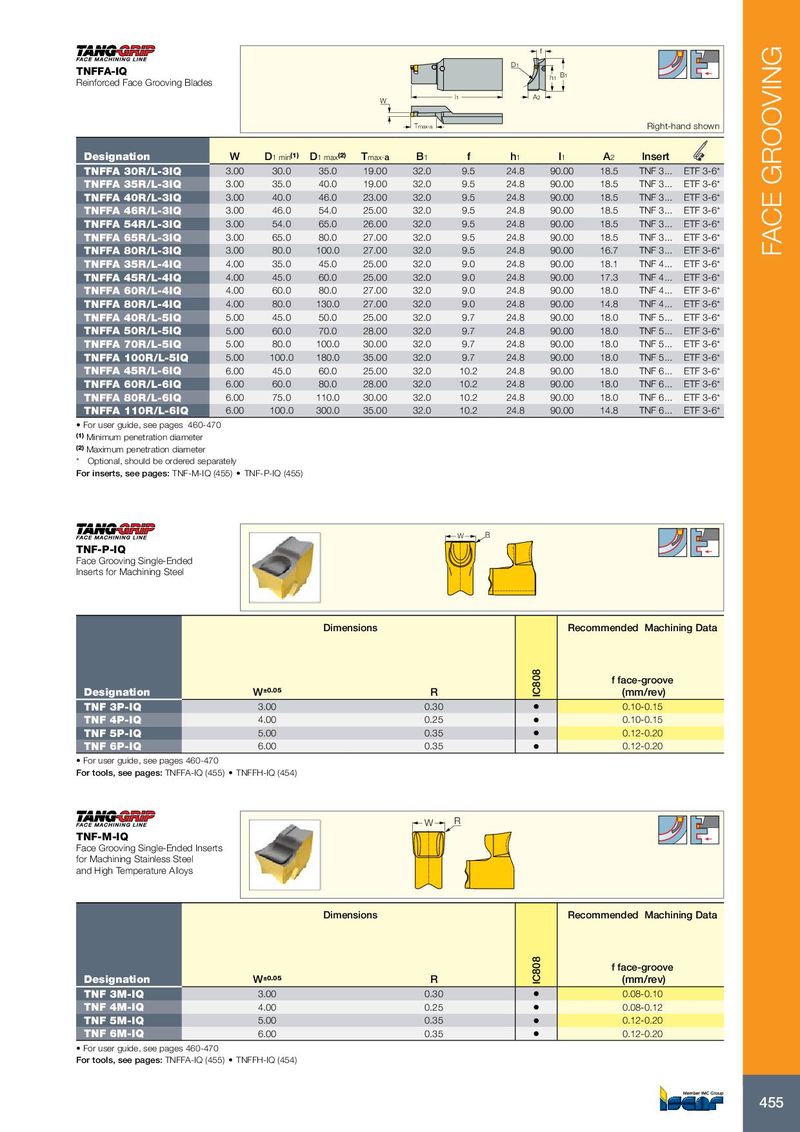 f D1 TNFFA-IQ h1 B1 Reinforced Face Grooving Blades l1 W A2 Tmax-a Right-hand shown Designation W D 1 min (1) D 1 max (2) T max- a B 1 f h 1 l 1 A 2 Insert TNFFA 30R/L-3IQ 3.00 30.0 35.0 19.00 32.0 9.5 24.8 90.00 18.5 TNF 3... ETF 3-6* TNFFA 35R/L-3IQ 3.00 35.0 40.0 19.00 32.0 9.5 24.8 90.00 18.5 TNF 3... ETF 3-6* TNFFA 40R/L-3IQ 3.00 40.0 46.0 23.00 32.0 9.5 24.8 90.00 18.5 TNF 3... ETF 3-6* TNFFA 46R/L-3IQ 3.00 46.0 54.0 25.00 32.0 9.5 24.8 90.00 18.5 TNF 3... ETF 3-6* TNFFA 54R/L-3IQ 3.00 54.0 65.0 26.00 32.0 9.5 24.8 90.00 18.5 TNF 3... ETF 3-6* TNFFA 65R/L-3IQ 3.00 65.0 80.0 27.00 32.0 9.5 24.8 90.00 18.5 TNF 3... ETF 3-6* TNFFA 80R/L-3IQ 3.00 80.0 100.0 27.00 32.0 9.5 24.8 90.00 16.7 TNF 3... ETF 3-6* FACE GROOVING TNFFA 35R/L-4IQ 4.00 35.0 45.0 25.00 32.0 9.0 24.8 90.00 18.1 TNF 4... ETF 3-6* TNFFA 45R/L-4IQ 4.00 45.0 60.0 25.00 32.0 9.0 24.8 90.00 17.3 TNF 4... ETF 3-6* TNFFA 60R/L-4IQ 4.00 60.0 80.0 27.00 32.0 9.0 24.8 90.00 18.0 TNF 4... ETF 3-6* TNFFA 80R/L-4IQ 4.00 80.0 130.0 27.00 32.0 9.0 24.8 90.00 14.8 TNF 4... ETF 3-6* TNFFA 40R/L-5IQ 5.00 45.0 50.0 25.00 32.0 9.7 24.8 90.00 18.0 TNF 5... ETF 3-6* TNFFA 50R/L-5IQ 5.00 60.0 70.0 28.00 32.0 9.7 24.8 90.00 18.0 TNF 5... ETF 3-6* TNFFA 70R/L-5IQ 5.00 80.0 100.0 30.00 32.0 9.7 24.8 90.00 18.0 TNF 5... ETF 3-6* TNFFA 100R/L-5IQ 5.00 100.0 180.0 35.00 32.0 9.7 24.8 90.00 18.0 TNF 5... ETF 3-6* TNFFA 45R/L-6IQ 6.00 45.0 60.0 25.00 32.0 10.2 24.8 90.00 18.0 TNF 6... ETF 3-6* TNFFA 60R/L-6IQ 6.00 60.0 80.0 28.00 32.0 10.2 24.8 90.00 18.0 TNF 6... ETF 3-6* TNFFA 80R/L-6IQ 6.00 75.0 110.0 30.00 32.0 10.2 24.8 90.00 18.0 TNF 6... ETF 3-6* TNFFA 110R/L-6IQ 6.00 100.0 300.0 35.00 32.0 10.2 24.8 90.00 14.8 TNF 6... ETF 3-6* • For user guide, see pages 460-470 (1) Minimum penetration diameter (2) Maximum penetration diameter * Optional, should be ordered separately For inserts, see pages: TNF-M-IQ (455) • TNF-P-IQ (455) W R TNF-P-IQ Face Grooving Single-Ended Inserts for Machining Steel Dimensions Recommended Machining Data f face-groove Designation W ±0.05 R IC808 (mm/rev) TNF 3P-IQ 3.00 0.30 • 0.10-0.15 TNF 4P-IQ 4.00 0.25 • 0.10-0.15 TNF 5P-IQ 5.00 0.35 • 0.12-0.20 TNF 6P-IQ 6.00 0.35 • 0.12-0.20 • For user guide, see pages 460-470 For tools, see pages: TNFFA-IQ (455) • TNFFH-IQ (454) W R TNF-M-IQ Face Grooving Single-Ended Inserts for Machining Stainless Steel and High Temperature Alloys Dimensions Recommended Machining Data f face-groove Designation W ±0.05 R IC808 (mm/rev) TNF 3M-IQ 3.00 0.30 • 0.08-0.10 TNF 4M-IQ 4.00 0.25 • 0.08-0.12 TNF 5M-IQ 5.00 0.35 • 0.12-0.20 TNF 6M-IQ 6.00 0.35 • 0.12-0.20 • For user guide, see pages 460-470 For tools, see pages: TNFFA-IQ (455) • TNFFH-IQ (454) 455