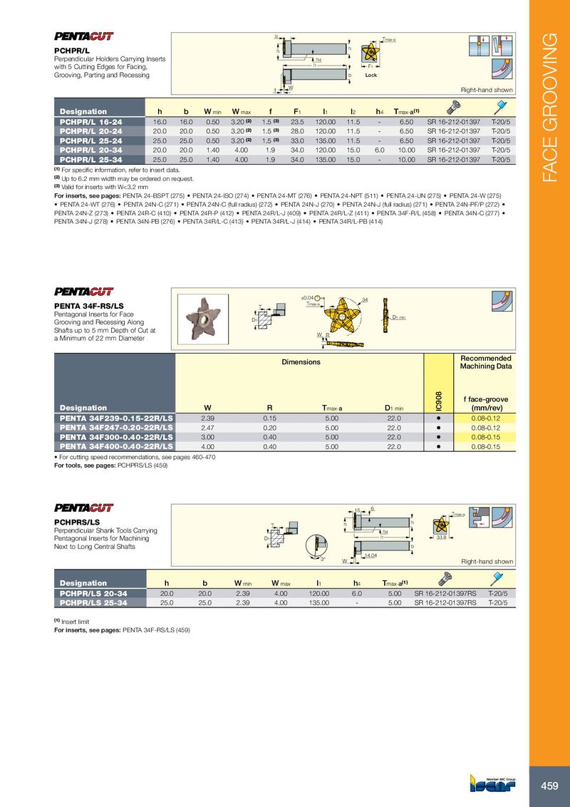 l2 Tmax-a h PCHPR/L h Perpendicular Holders Carrying Inserts h4 with 5 Cutting Edges for Facing, l1 F1 Grooving, Parting and Recessing b Lock f W Right-hand shown Designation h b W min W max f F 1 l 1 l 2 h 4 T max- a (1) PCHPR/L 16-24 16.0 16.0 0.50 3.20 (2) 1.5 (3) 23.5 120.00 11.5 - 6.50 SR 16-212-01397 T-20/5 PCHPR/L 20-24 20.0 20.0 0.50 3.20 (2) 1.5 (3) 28.0 120.00 11.5 - 6.50 SR 16-212-01397 T-20/5 PCHPR/L 25-24 25.0 25.0 0.50 3.20 (2) 1.5 (3) 33.0 135.00 11.5 - 6.50 SR 16-212-01397 T-20/5 PCHPR/L 20-34 20.0 20.0 1.40 4.00 1.9 34.0 120.00 15.0 6.0 10.00 SR 16-212-01397 T-20/5 PCHPR/L 25-34 25.0 25.0 1.40 4.00 1.9 34.0 135.00 15.0 - 10.00 SR 16-212-01397 T-20/5 (1) For specific information, refer to insert data. (2) Up to 6.2 mm width may be ordered on request. FACE GROOVING (3) Valid for inserts with W<3.2 mm For inserts, see pages: PENTA 24-BSPT (275) • PENTA 24-ISO (274) • PENTA 24-MT (276) • PENTA 24-NPT (511) • PENTA 24-UN (275) • PENTA 24-W (275) • PENTA 24-WT (276) • PENTA 24N-C (271) • PENTA 24N-C (full radius) (272) • PENTA 24N-J (270) • PENTA 24N-J (full radius) (271) • PENTA 24N-PF/P (272) • PENTA 24N-Z (273) • PENTA 24R-C (410) • PENTA 24R-P (412) • PENTA 24R/L-J (409) • PENTA 24R/L-Z (411) • PENTA 34F-R/L (458) • PENTA 34N-C (277) • PENTA 34N-J (278) • PENTA 34N-PB (276) • PENTA 34R/L-C (413) • PENTA 34R/L-J (414) • PENTA 34R/L-PB (414) ±0.04 34 Tmax-a PENTA 34F-RS/LS T Pentagonal Inserts for Face D1 min Grooving and Recessing Along D1 Shafts up to 5 mm Depth of Cut at W R a Minimum of 22 mm Diameter Recommended Dimensions Machining Data f face-groove Designation W R T max- a D 1 min IC908 (mm/rev) PENTA 34F239-0.15-22R/LS 2.39 0.15 5.00 22.0 • 0.08-0.12 PENTA 34F247-0.20-22R/LS 2.47 0.20 5.00 22.0 • 0.08-0.12 PENTA 34F300-0.40-22R/LS 3.00 0.40 5.00 22.0 • 0.08-0.15 PENTA 34F400-0.40-22R/LS 4.00 0.40 5.00 22.0 • 0.08-0.15 • For cutting speed recommendations, see pages 460-470 For tools, see pages: PCHPRS/LS (459) 15 6 Tmax-a PCHPRS/LS T h h Perpendicular Shank Tools Carrying h4 Pentagonal Inserts for Machining D1 l1 33.8 Next to Long Central Shafts b 14.04 3° W Right-hand shown Designation h b W min W max l 1 h 4 T max- a (1) PCHPR/LS 20-34 20.0 20.0 2.39 4.00 120.00 6.0 5.00 SR 16-212-01397RS T-20/5 PCHPR/LS 25-34 25.0 25.0 2.39 4.00 135.00 - 5.00 SR 16-212-01397RS T-20/5 (1) Insert limit For inserts, see pages: PENTA 34F-RS/LS (459) 459