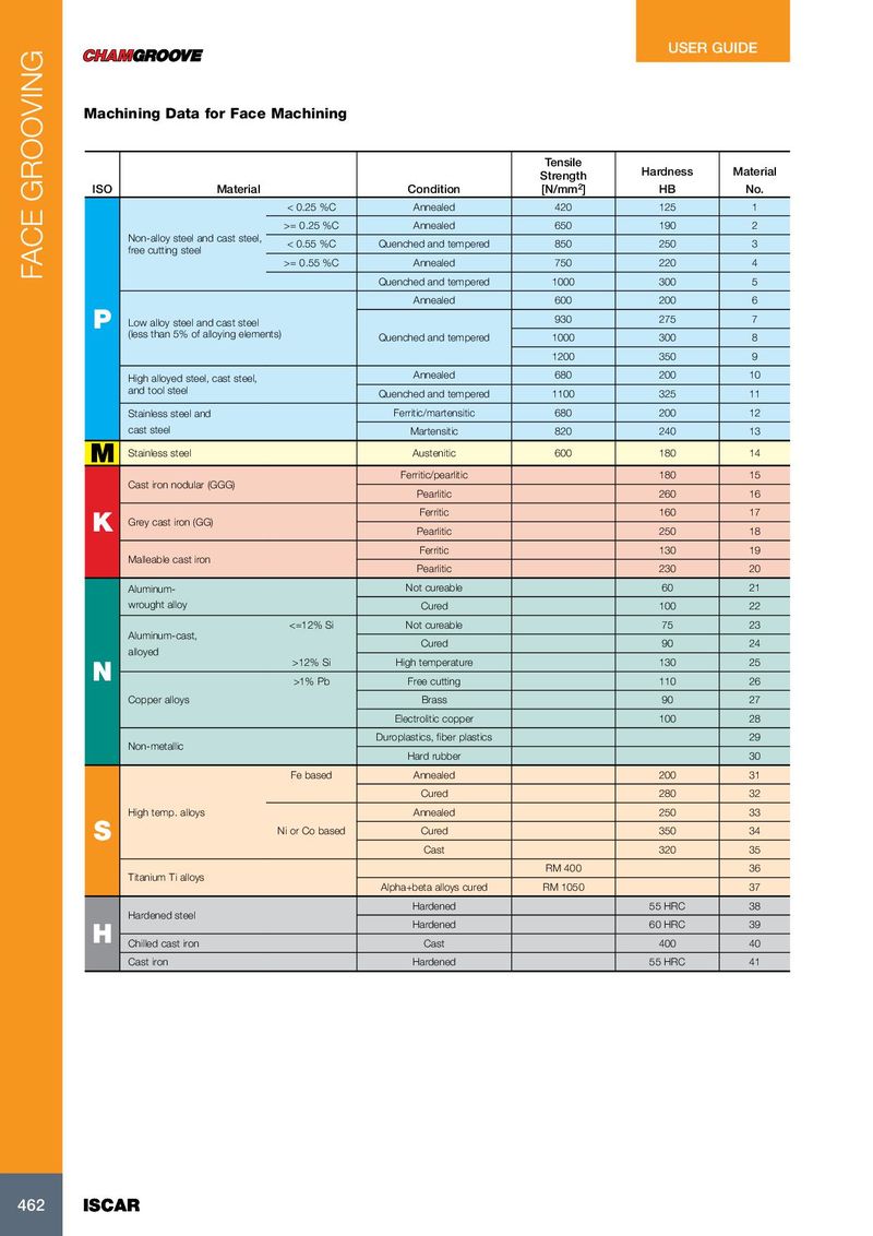 USER GUIDE Machining Data for Face Machining Tensile Strength Hardness Material ISO Material Condition [N/mm 2 ] HB No. < 0.25 %C Annealed 420 125 1 >= 0.25 %C Annealed 650 190 2 Non-alloy steel and cast steel, < 0.55 %C Quenched and tempered 850 250 3 free cutting steel >= 0.55 %C Annealed 750 220 4 FACE GROOVING Quenched and tempered 1000 300 5 Annealed 600 200 6 930 275 7 P Low alloy steel and cast steel (less than 5% of alloying elements) Quenched and tempered 1000 300 8 1200 350 9 High alloyed steel, cast steel, Annealed 680 200 10 and tool steel Quenched and tempered 1100 325 11 Stainless steel and Ferritic/martensitic 680 200 12 cast steel Martensitic 820 240 13 Stainless steel Austenitic 600 180 14 M Ferritic/pearlitic 180 15 Cast iron nodular (GGG) Pearlitic 260 16 Ferritic 160 17 Grey cast iron (GG) K Pearlitic 250 18 Ferritic 130 19 Malleable cast iron Pearlitic 230 20 Aluminum- Not cureable 60 21 wrought alloy Cured 100 22 <=12% Si Not cureable 75 23 Aluminum-cast, Cured 90 24 alloyed >12% Si High temperature 130 25 N >1% Pb Free cutting 110 26 Copper alloys Brass 90 27 Electrolitic copper 100 28 Duroplastics, fiber plastics 29 Non-metallic Hard rubber 30 Fe based Annealed 200 31 Cured 280 32 High temp. alloys Annealed 250 33 Ni or Co based Cured 350 34 S Cast 320 35 RM 400 36 Titanium Ti alloys Alpha+beta alloys cured RM 1050 37 Hardened 55 HRC 38 Hardened steel Hardened 60 HRC 39 H Chilled cast iron Cast 400 40 Cast iron Hardened 55 HRC 41 462 462 ISCAR ISCAR