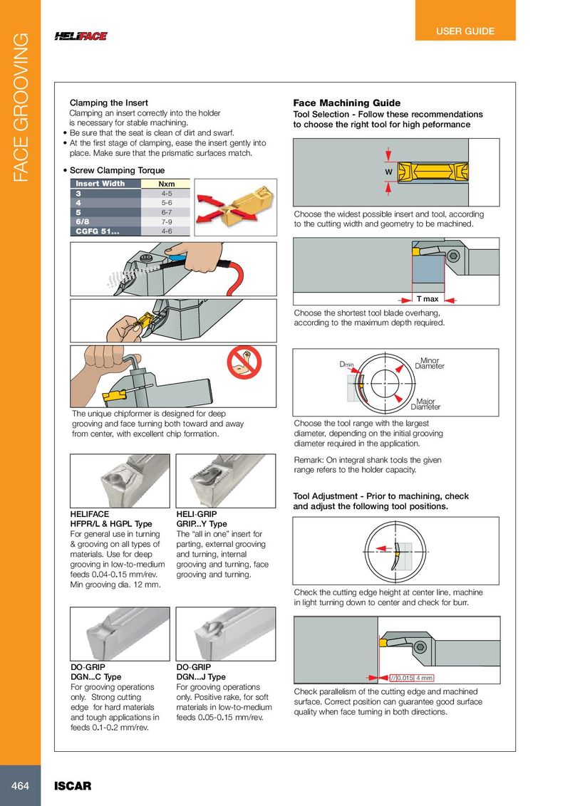 USER GUIDE Clamping the Insert Face Machining Guide Clamping an insert correctly into the holder Tool Selection - Follow these recommendations is necessary for stable machining. to choose the right tool for high peformance • Be sure that the seat is clean of dirt and swarf. • At the first stage of clamping, ease the insert gently into place. Make sure that the prismatic surfaces match. • Screw Clamping Torque W FACE GROOVING Insert Width Nxm 3 4-5 4 5-6 5 6-7 Choose the widest possible insert and tool, according 6/8 7-9 to the cutting width and geometry to be machined. CGFG 51... 4-6 T max Choose the shortest tool blade overhang, according to the maximum depth required. Minor Dmin Diameter Major Diameter The unique chipformer is designed for deep grooving and face turning both toward and away Choose the tool range with the largest from center, with excellent chip formation. diameter, depending on the initial grooving diameter required in the application. Remark: On integral shank tools the given range refers to the holder capacity. Tool Adjustment - Prior to machining, check and adjust the following tool positions. HELIFACE HELI-GRIP HFPR/L & HGPL Type GRIP...Y Type For general use in turning The “all in one” insert for & grooving on all types of parting, external grooving materials. Use for deep and turning, internal grooving in low-to-medium grooving and turning, face feeds 0.04-0.15 mm/rev. grooving and turning. Min grooving dia. 12 mm. Check the cutting edge height at center line, machine in light turning down to center and check for burr. DO-GRIP DO-GRIP DGN...C Type DGN...J Type // 0.015 4 mm For grooving operations For grooving operations Check parallelism of the cutting edge and machined only. Strong cutting only. Positive rake, for soft surface. Correct position can guarantee good surface edge for hard materials materials in low-to-medium quality when face turning in both directions. and tough applications in feeds 0.05-0.15 mm/rev. feeds 0.1-0.2 mm/rev. 464 464 ISCAR ISCAR