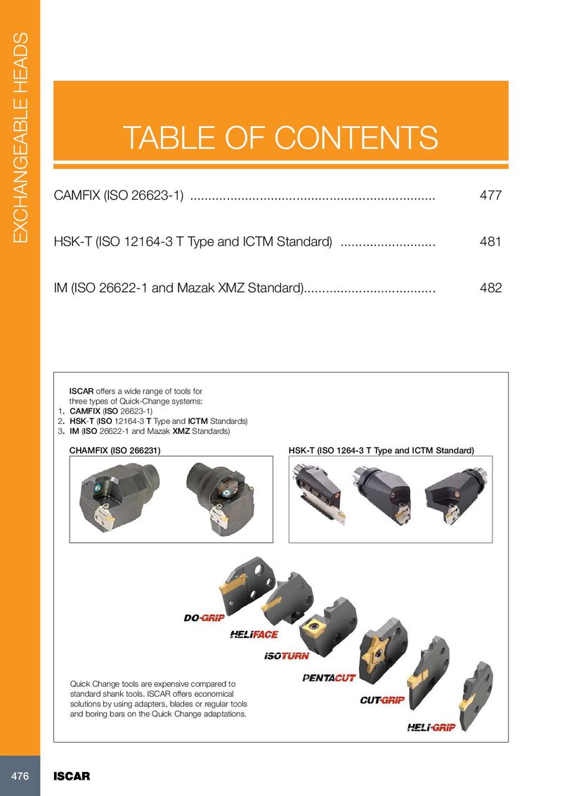 TABLE OF CONTENTS CAMFIX (ISO 26623-1) ................................................................... 477 EXCHANGEABLE HEADS HSK-T (ISO 12164-3 T Type and ICTM Standard) .......................... 481 IM (ISO 26622-1 and Mazak XMZ Standard) .................................... 482 ISCAR offers a wide range of tools for three types of Quick-Change systems: 1. CAMFIX (ISO 26623-1) 2. HSK-T (ISO 12164-3 T Type and ICTM Standards) 3. IM (ISO 26622-1 and Mazak XMZ Standards) CHAMFIX (ISO 266231) HSK-T (ISO 1264-3 T Type and ICTM Standard) Quick Change tools are expensive compared to standard shank tools. ISCAR offers economical solutions by using adapters, blades or regular tools and boring bars on the Quick Change adaptations. 476 476 ISCAR ISCAR