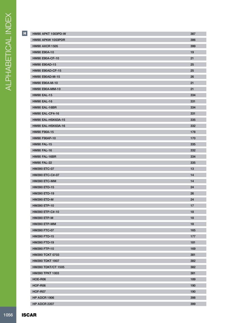 H HM90 APKT 1003PD-W 387 HM90 APKW 1003PDR 386 HM90 AXCR 1505 399 HM90 E90A-10 19 HM90 E90A-CF-10 21 HM90 E90AD-15 25 HM90 E90AD-CF-15 25 HM90 E90AD-M-15 26 HM90 E90A-M-10 21 ALPHABETICAL INDEX HM90 E90A-MM-10 21 HM90 EAL-15 334 HM90 EAL-16 331 HM90 EAL-16BR 334 HM90 EAL-CF4-16 331 HM90 EAL-HSK63A-15 335 HM90 EAL-HSK63A-16 332 HM90 F90A-15 178 HM90 F90AP-10 170 HM90 FAL-15 335 HM90 FAL-16 332 HM90 FAL-16BR 334 HM90 FAL-22 335 HM390 ETC-07 13 HM390 ETC-C#-07 14 HM390 ETC-MM 14 HM390 ETD-15 24 HM390 ETD-19 26 HM390 ETD-M 24 HM390 ETP-10 17 HM390 ETP-C#-10 18 HM390 ETP-M 18 HM390 ETP-MM 18 HM390 FTC-07 165 HM390 FTD-15 177 HM390 FTD-19 181 HM390 FTP-10 169 HM390 TCKT 0703 381 HM390 TDKT 1907 382 HM390 TDKT/CT 1505 382 HM390 TPKT 1003 381 HOE-R06 189 HOF-R06 190 HOF-R07 190 HP ADCR 1906 398 HP ADCR 2207 399 1056 ISCAR