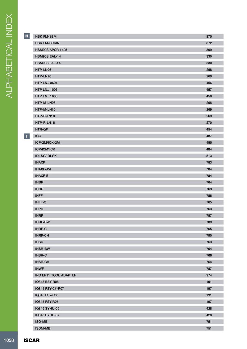 H HSK FM-SEM 875 HSK FM-SRKIN 872 HSM90S APCR 1405 399 HSM90S EAL-14 330 HSM90S FAL-14 330 HTP-LN06 268 HTP-LN10 269 HTP LN.. 0604 456 HTP LN.. 1006 457 ALPHABETICAL INDEX HTP LN.. 1606 458 HTP-M-LN06 268 HTP-M-LN10 269 HTP-R-LN10 269 HTP-R-LN16 270 HTR-QF 454 I ICG 487 ICP-2M\ICK-2M 485 ICP\ICM\ICK 484 IDI-SG/IDI-SK 513 IHAXF 783 IHAXF-AVI 784 IHAXF-E 784 IHBR 764 IHCR 763 IHFF 786 IHFF-C 765 IHPR 763 IHRF 787 IHRF-BW 789 IHRF-C 765 IHRF-CH 790 IHSR 763 IHSR-BW 764 IHSR-C 766 IHSR-CH 764 IHWF 787 IND ER11 TOOL ADAPTER 974 IQ845 ESY-R05 191 IQ845 FSY-C#-R07 197 IQ845 FSY-R05 191 IQ845 FSY-R07 197 IQ845 SYHU-05 428 IQ845 SYHU-07 428 ISO-MB 751 ISOM-MB 751 1058 ISCAR