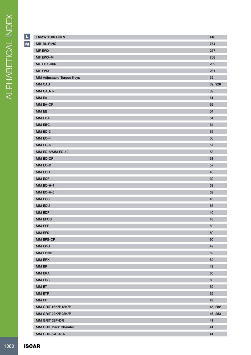 L LNMW 1506 PNTN 416 M MB-BL-RING 754 MF EWX 257 MF EWX-M 258 MF FHX-R06 262 MF FWX 261 MM Adjustable Torque Keys 35 MM CAB 69, 928 MM CAB-T-T 69 ALPHABETICAL INDEX MM EA 61 MM EA-CF 62 MM EB 54 MM EBA 54 MM EBC 54 MM EC-3 55 MM EC-4 56 MM EC-6 57 MM EC-8/MM EC-10 58 MM EC-CF 58 MM EC-D 57 MM ECD 43 MM ECF 39 MM EC-H-4 59 MM EC-H-5 59 MM ECS 43 MM ECU 55 MM EDF 40 MM EFCB 43 MM EFF 50 MM EFS 59 MM EFS-CF 60 MM EPG 42 MM EPNC 62 MM EPX 62 MM ER 42 MM ERA 60 MM ERS 60 MM ET 52 MM ETR 52 MM FF 49 MM GRIT-16K/P,18K/P 45, 282 MM GRIT-22K/P,28K/P 46, 283 MM GRIT 28P-DR 41 MM GRIT Back Chamfer 41 MM GRIT-K/P-45A 41 1060 ISCAR