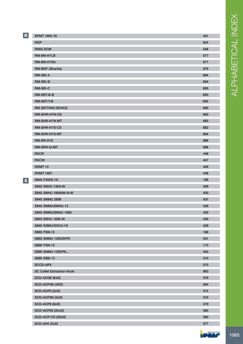 R RFMT 1905-76 451 RGP 624 RING DCM 546 RM-BN-H7LB 677 RM-BN-H7SA 677 RM-BNT (Shanks) 676 RM-SEI-A 694 RM-SEI-B 694 RM-SEI-C 695 RM-SET-B-B 693 ALPHABETICAL INDEX RM-SET-T-B 692 RM SETTING DEVICE 695 RM-SHR-H7N-CS 683 RM-SHR-H7N-MT 685 RM-SHR-H7S-CS 682 RM-SHR-H7S-MT 684 RM-SR-H7S 686 RM-SRH-Q-MT 686 RXCR 448 RXCW 447 RXMT 10 448 RXMT 1607 448 S S845 F45SX-16 198 S845 SNHU 1305-W 429 S845 SNHU 1806AN-N-W 430 S845 SNMU 2608 437 S845 SNMU/SNHU-13 429 S845 SNMU/SNHU 1806 430 S845 SXHU 1606-W 430 S845 SXMU/SXCU-16 429 S865 FSN-13 188 S865 SNMU 1305ZNTR 431 S890 FSN-13 173 S890 SNMU 1305PN... 442 S890 SSB-13 310 SCCD-AP5 575 SC Collet Extraction Hook 983 SCD-ACG8 (8xD) 578 SCD-ACP3N (3XD) 564 SCD-ACP5 (5xD) 572 SCD-ACP5N (5xD) 570 SCD-ACP8 (8xD) 579 SCD-ACP20 (20xD) 580 SCD-ACP-CS (20xD) 580 SCD-AH5 (5xD) 577 1065