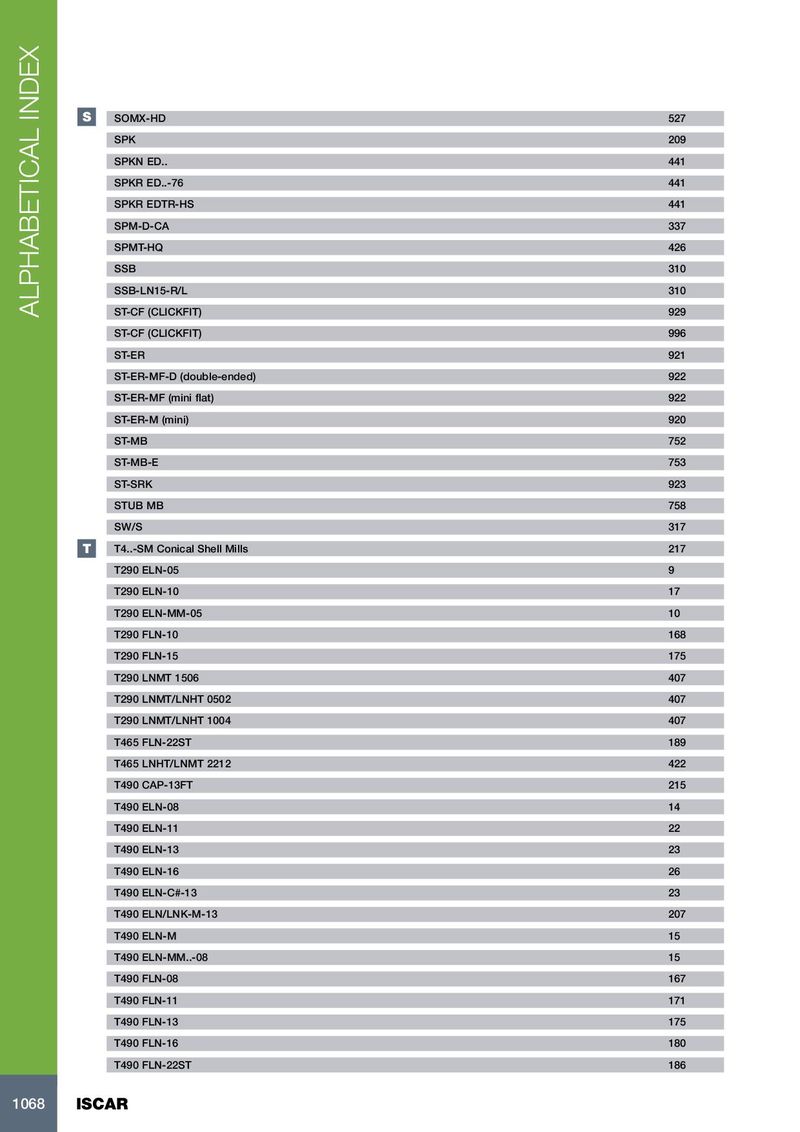 S SOMX-HD 527 SPK 209 SPKN ED.. 441 SPKR ED..-76 441 SPKR EDTR-HS 441 SPM-D-CA 337 SPMT-HQ 426 SSB 310 SSB-LN15-R/L 310 ALPHABETICAL INDEX ST-CF (CLICKFIT) 929 ST-CF (CLICKFIT) 996 ST-ER 921 ST-ER-MF-D (double-ended) 922 ST-ER-MF (mini flat) 922 ST-ER-M (mini) 920 ST-MB 752 ST-MB-E 753 ST-SRK 923 STUB MB 758 SW/S 317 T T4..-SM Conical Shell Mills 217 T290 ELN-05 9 T290 ELN-10 17 T290 ELN-MM-05 10 T290 FLN-10 168 T290 FLN-15 175 T290 LNMT 1506 407 T290 LNMT/LNHT 0502 407 T290 LNMT/LNHT 1004 407 T465 FLN-22ST 189 T465 LNHT/LNMT 2212 422 T490 CAP-13FT 215 T490 ELN-08 14 T490 ELN-11 22 T490 ELN-13 23 T490 ELN-16 26 T490 ELN-C#-13 23 T490 ELN/LNK-M-13 207 T490 ELN-M 15 T490 ELN-MM..-08 15 T490 FLN-08 167 T490 FLN-11 171 T490 FLN-13 175 T490 FLN-16 180 T490 FLN-22ST 186 1068 ISCAR