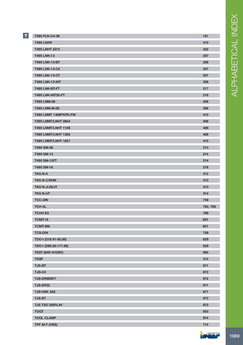 T T490 FLN-C#-08 167 T490 LNAR 410 T490 LNHT 2212 422 T490 LNK-13 207 T490 LNK-13-BT 208 T490 LNK-13-C# 207 T490 LNK-13-CF 207 T490 LNK-13-INT 208 T490 LNK-BT-FT 217 T490 LNK-INT50-FT 216 ALPHABETICAL INDEX T490 LNM-08 206 T490 LNM-M-08 206 T490 LNMT 1306PNTR-FW 410 T490 LNMT/LNHT 0804 408 T490 LNMT/LNHT 1106 408 T490 LNMT/LNHT 1306 409 T490 LNMT/LNHT 1607 410 T490 SM-08 213 T490 SM-13 214 T490 SM-13FT 214 T490 SM-16 218 TAG N-A 312 TAG N-C/W/M 313 TAG N-J/JS/JT 313 TAG N-UT 314 TCC-DIN 759 TCH AL 762, 788 TCHH EX 789 TCMT-19 807 TCMT-SM 807 TCS-DIN 758 TDO-I (D18.41-65.00) 629 TDO-I (D65.00-171.99) 629 TEST BAR HYDRO 965 TGSF 312 TJS-BT 971 TJS-C# 972 TJS-DIN69871 972 TJS-ER32 971 TJS-HSK A63 971 TJS-ST 972 TJS TSD DISPLAY 972 TOGT 650 TOOL CLAMP 974 TPF M-F (HSS) 715 1069