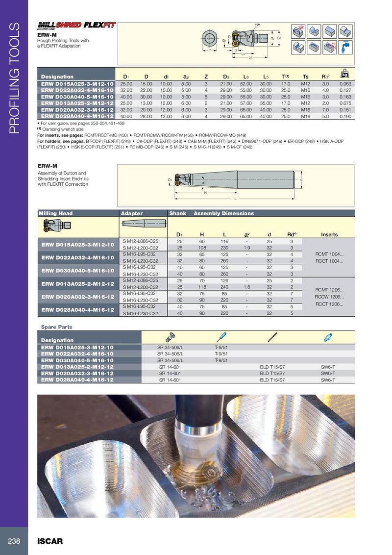 T (1) ERW-M D Rough Profiling Tools with D 1 Ts D3 Rd° a FLEXFIT Adaptation T d i L 5 L6 Designation D 1 D di a p Z D 3 L 6 L 5 T (1) kg Ts R d ° ERW D015A025-3-M12-10 25.00 15.00 10.00 5.00 3 21.00 52.00 30.00 17.0 M12 3.0 0.063 ERW D022A032-4-M16-10 32.00 22.00 10.00 5.00 4 29.00 55.00 30.00 25.0 M16 4.0 0.127 ERW D030A040-5-M16-10 40.00 30.00 10.00 5.00 5 29.00 55.00 30.00 25.0 M16 3.0 0.163 ERW D013A025-2-M12-12 25.00 13.00 12.00 6.00 2 21.00 57.00 35.00 17.0 M12 2.0 0.075 ERW D020A032-3-M16-12 32.00 20.00 12.00 6.00 3 29.00 65.00 40.00 25.0 M16 7.0 0.151 ERW D028A040-4-M16-12 40.00 28.00 12.00 6.00 4 29.00 65.00 40.00 25.0 M16 5.0 0.190 • For user guide, see pages 252-254,461-468 (1) Clamping wrench size PROFILING TOOLS For inserts, see pages: RCMT/RCCT-MO (450) • RCMT/RCMW/RCCW-FW (450) • RCMW/RCCW-MO (449) For holders, see pages: BT-ODP (FLEXFIT) (248) • C#-ODP (FLEXFIT) (248) • CAB M-M (FLEXFIT) (245) • DIN69871-ODP (249) • ER-ODP (249) • HSK A-ODP (FLEXFIT) (250) • HSK E-ODP (FLEXFIT) (251) • RE MB-ODP (246) • S M (245) • S M-C-H (245) • S M-CF (246) ERW-M Assembly of Button and Shredding Insert Endmills D1 d a° with FLEXFIT Connection H L Milling Head Adapter Shank Assembly Dimensions D 1 H L aº d Rdº Inserts S M12-L086-C25 25 60 116 - 25 3 ERW D015A025-3-M12-10 S M12-L200-C32 25 108 230 1.9 32 3 S M16-L95-C32 32 65 125 - 32 4 RCMT 1004... ERW D022A032-4-M16-10 S M16-L230-C32 32 80 260 - 32 4 RCCT 1004... S M16-L95-C32 40 65 125 - 32 3 ERW D030A040-5-M16-10 S M16-L230-C32 40 80 260 - 32 3 S M12-L086-C25 25 70 126 - 25 2 ERW D013A025-2-M12-12 S M12-L200-C32 25 118 240 1.8 32 2 RCMT 1206... S M16-L95-C32 32 75 85 - 32 7 ERW D020A032-3-M16-12 RCCW 1206... S M16-L230-C32 32 90 220 - 32 7 RCCT 1206... S M16-L95-C32 40 75 85 - 32 5 ERW D028A040-4-M16-12 S M16-L230-C32 40 90 220 - 32 5 Spare Parts Designation ERW D015A025-3-M12-10 SR 34-506/L T-9/51 ERW D022A032-4-M16-10 SR 34-506/L T-9/51 ERW D030A040-5-M16-10 SR 34-506/L T-9/51 ERW D013A025-2-M12-12 SR 14-601 BLD T15/S7 SW6-T ERW D020A032-3-M16-12 SR 14-601 BLD T15/S7 SW6-T ERW D028A040-4-M16-12 SR 14-601 BLD T15/S7 SW6-T 238 ISCAR